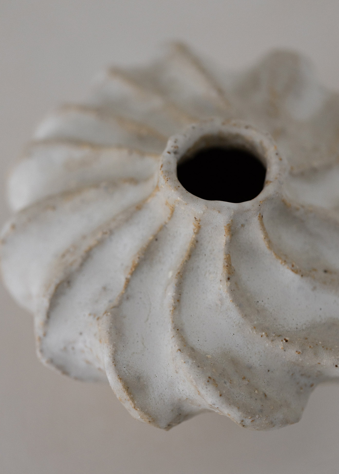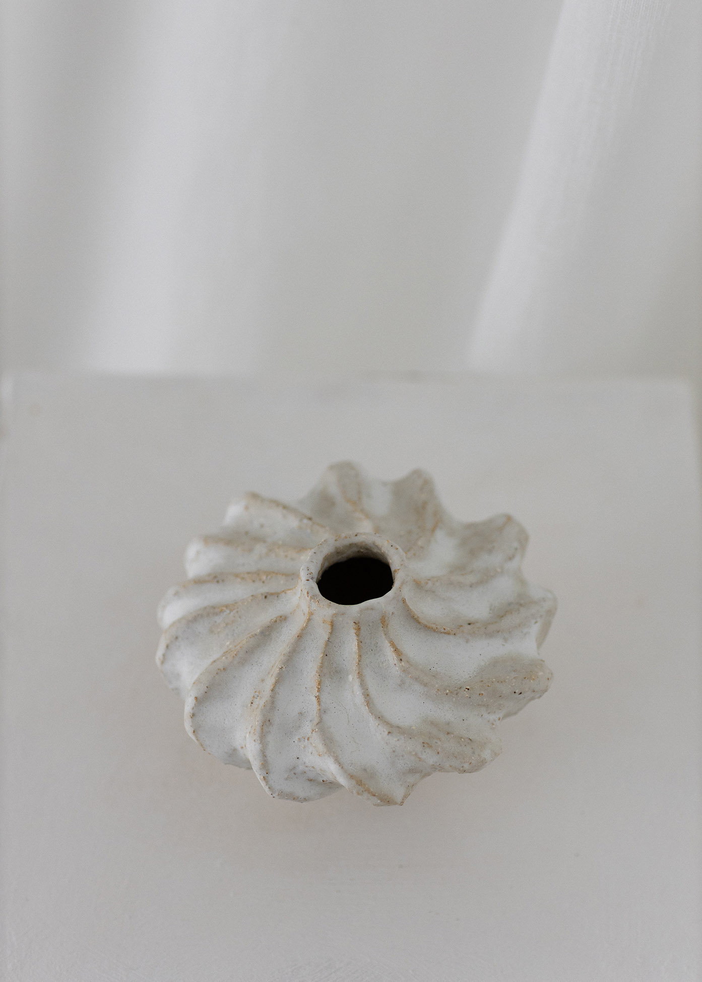 Vaaleasta, rouheasta kivitavarasavesta käsinvalmistettu vaasi. Lasitus vaalea/valkoinen niin sisä- kuin ulkopuolella. K 12cm x L 15cm. 2024-2025.