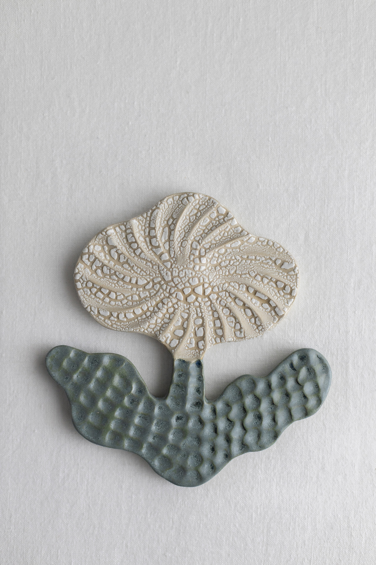 This ceramic relief is inspired by my passion for gardening. The piece is made from stoneware clay and glazed with two glazes (white & blue-green). Dimensions: H 17 cm x W 16 cm x D 1.5 cm. 2026.