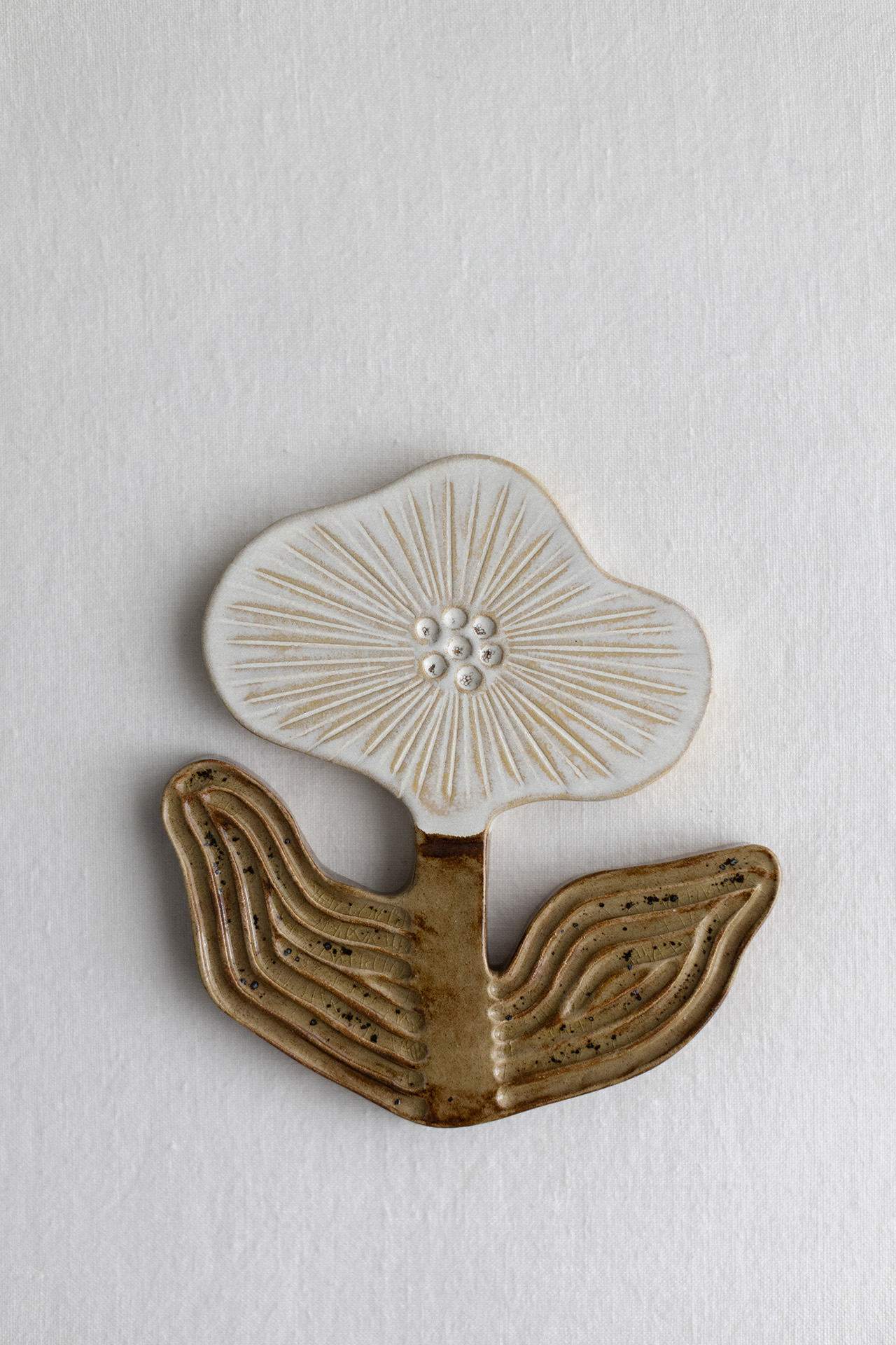 This ceramic relief is inspired by my passion for gardening. The piece is made from stoneware clay and glazed with two glazes (white & brown), and it also features dark speckles. Dimensions: H 16 cm x W 15 cm x D 1.5 cm. Year of creation: 2026.