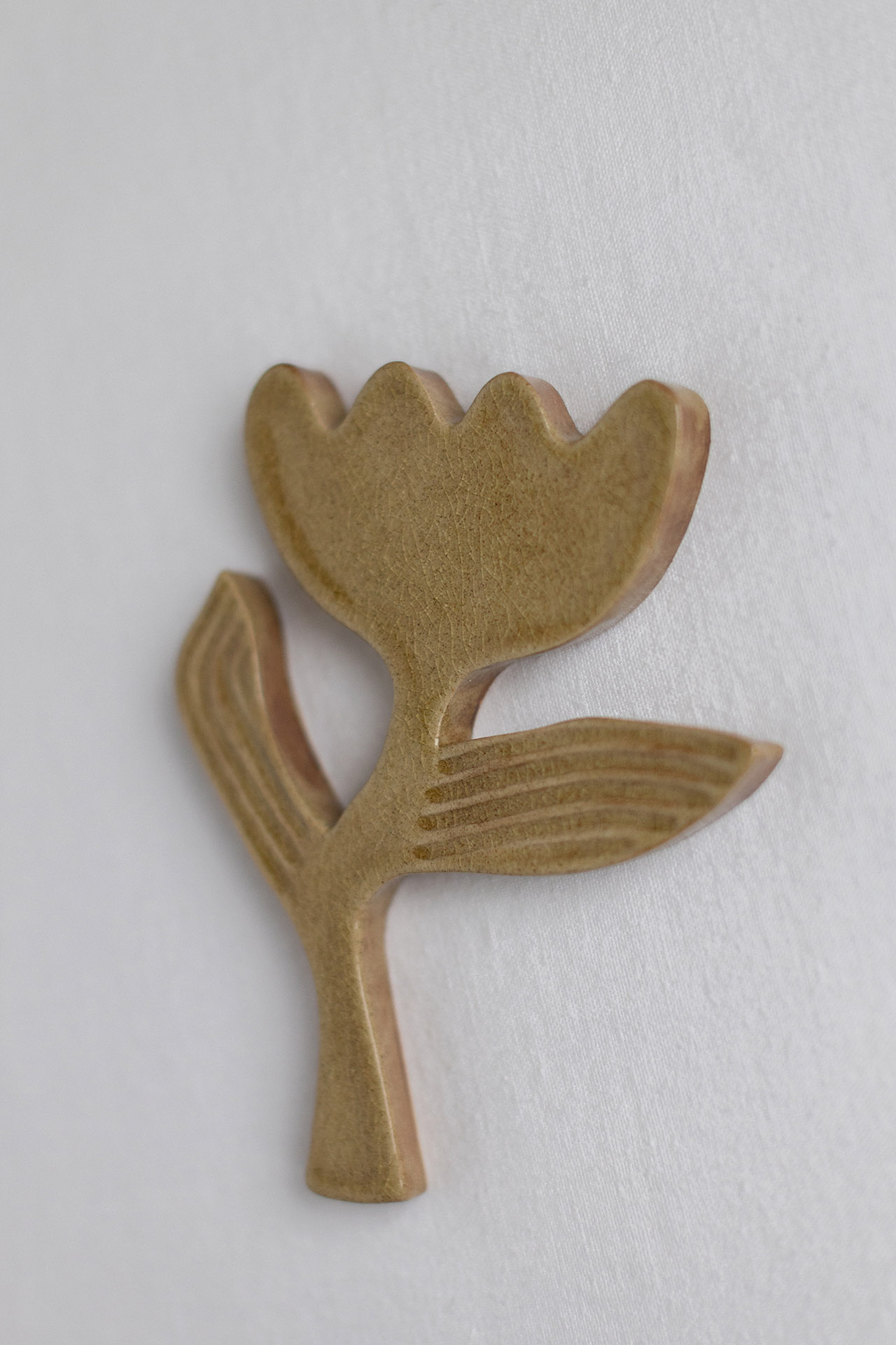 Keramiikkareliefi, joka on saanut inspiraationsa tulppaaneista ja valtavasta puutarhainnostuksestani. Teos on valmistettu kivitavarasavesta ja lasitettu kauniisti kraklaavalla, kellanruskealla lasitteella. K 16cm x 13cm. Valmistusvuosi 2025.