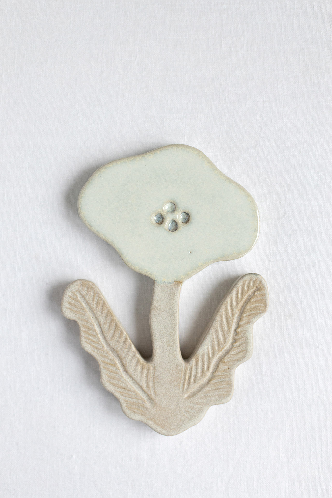 Keramiikkareliefi, joka on saanut inspiraationsa kotipuutarhani kukista. Teos on valmistettu kivitavarasavesta ja lasitettu kahdella vaalealla lasitteella (kiiltävä & matta), joista ylemmässä on hieman sinisen sävyjä. K 17cm x 12,5cm. Valmistusvuosi 2025.