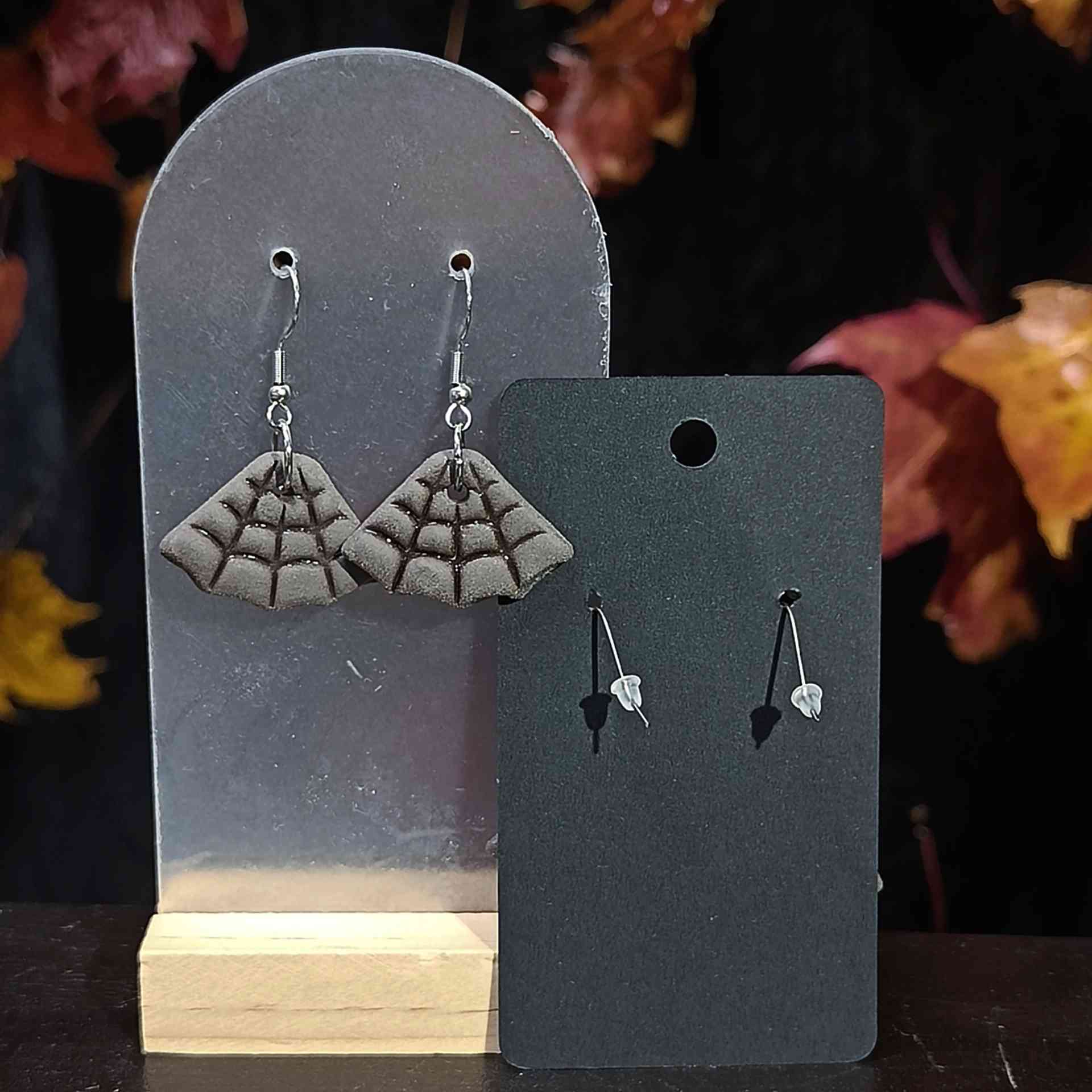 Keraamiset hämähäkinseittikorvakorut koukulla. Väri tummanharmaa. Kivitavarasavi, lasite. Koruosat ovat kirurginterästä suomalaiselta maahantuojalta. Sisältää silikonistopparit.