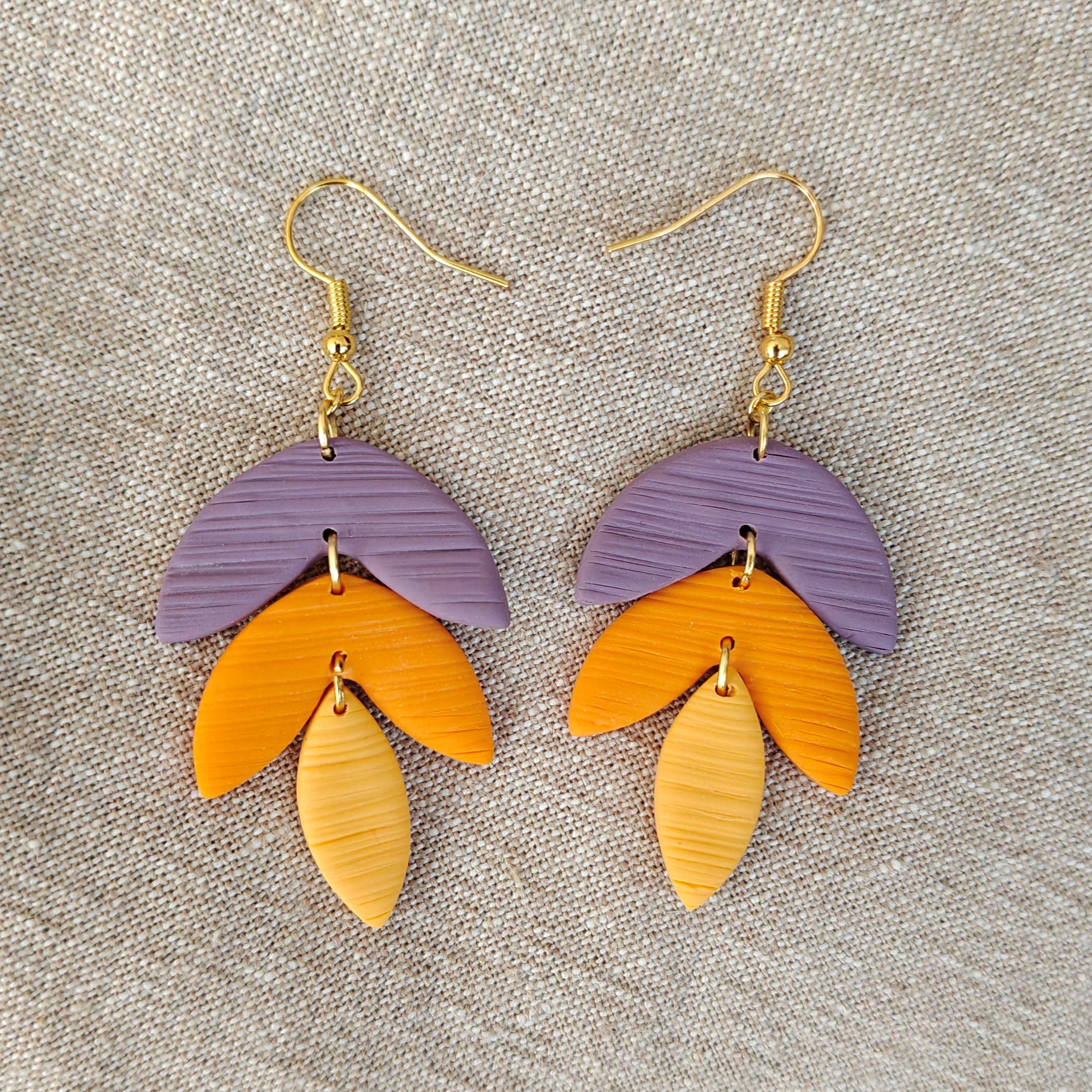 Polymeerimassasta valmistetut korvakorut. Korun korkeus koukkuineen n. 6,5 cm. Metalliosat kullanväristä rautaa. Nikkelitön.