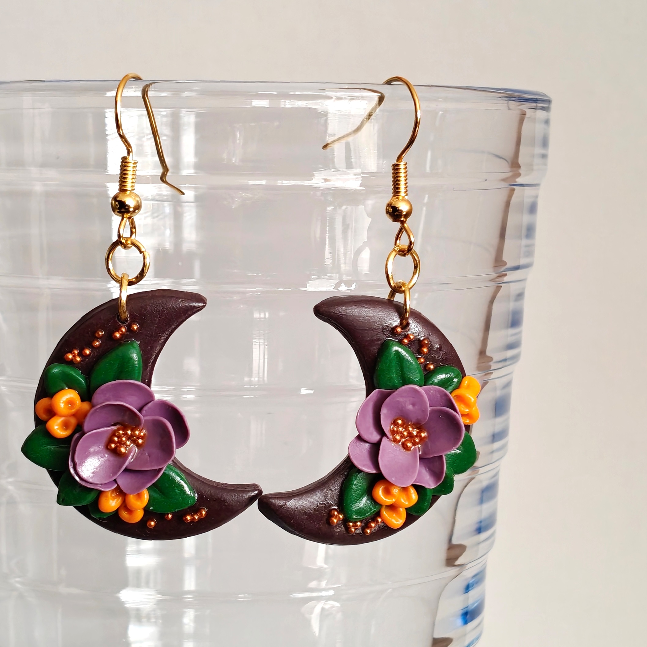 Polymeerimassasta valmistetut korvakorut. Korun korkeus koukkuineen n. 5 cm. Metalliosat kullanväristä rautaa. Nikkelitön.