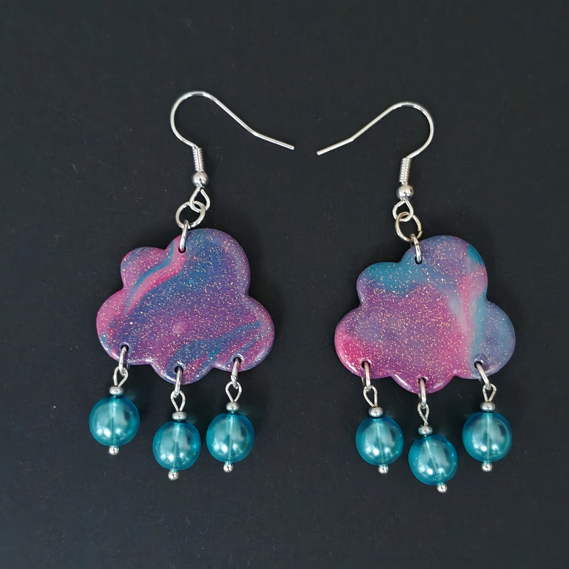 Korvakorut polymeerimassasta ja lasihelmistä. Korkeus koukun kanssa n. 6cm. Metalliosat hopeoitua messinkiä, nikkelitön.