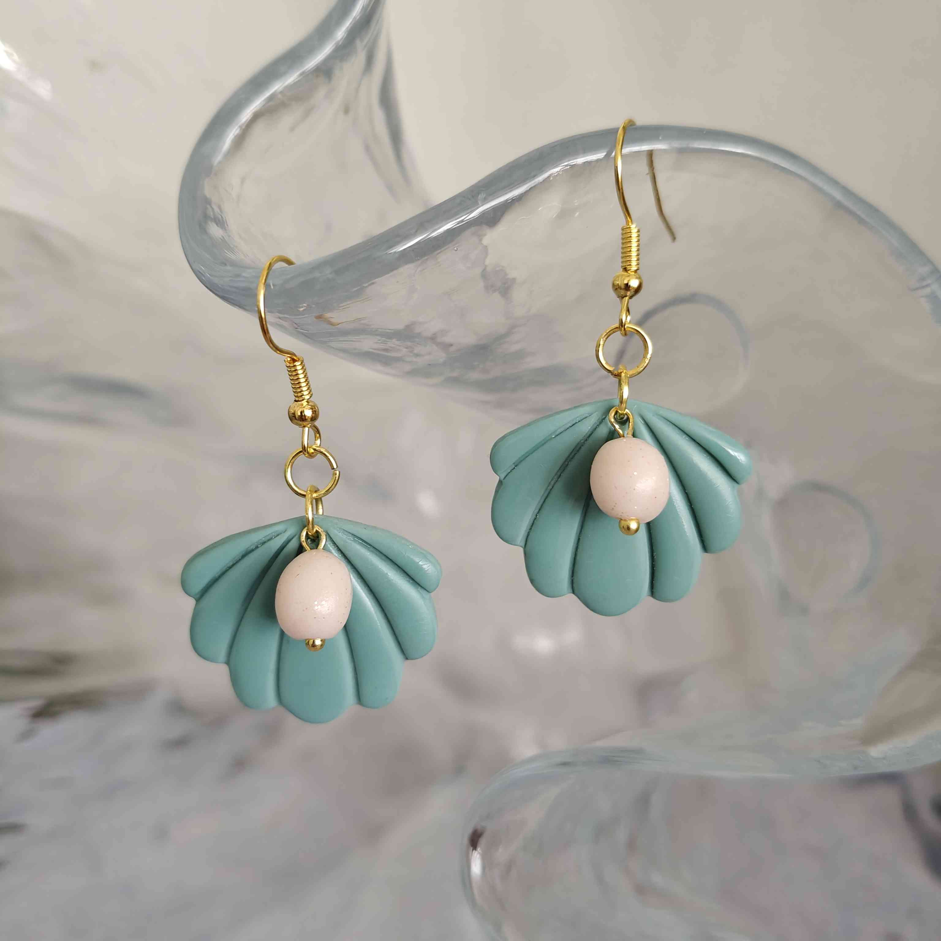 Korvakorut polymeerimassasta, metalliosat kullanväristä rautaa. Korun korkeus koukun kanssa n. 4,5cm. Nikkelitön.