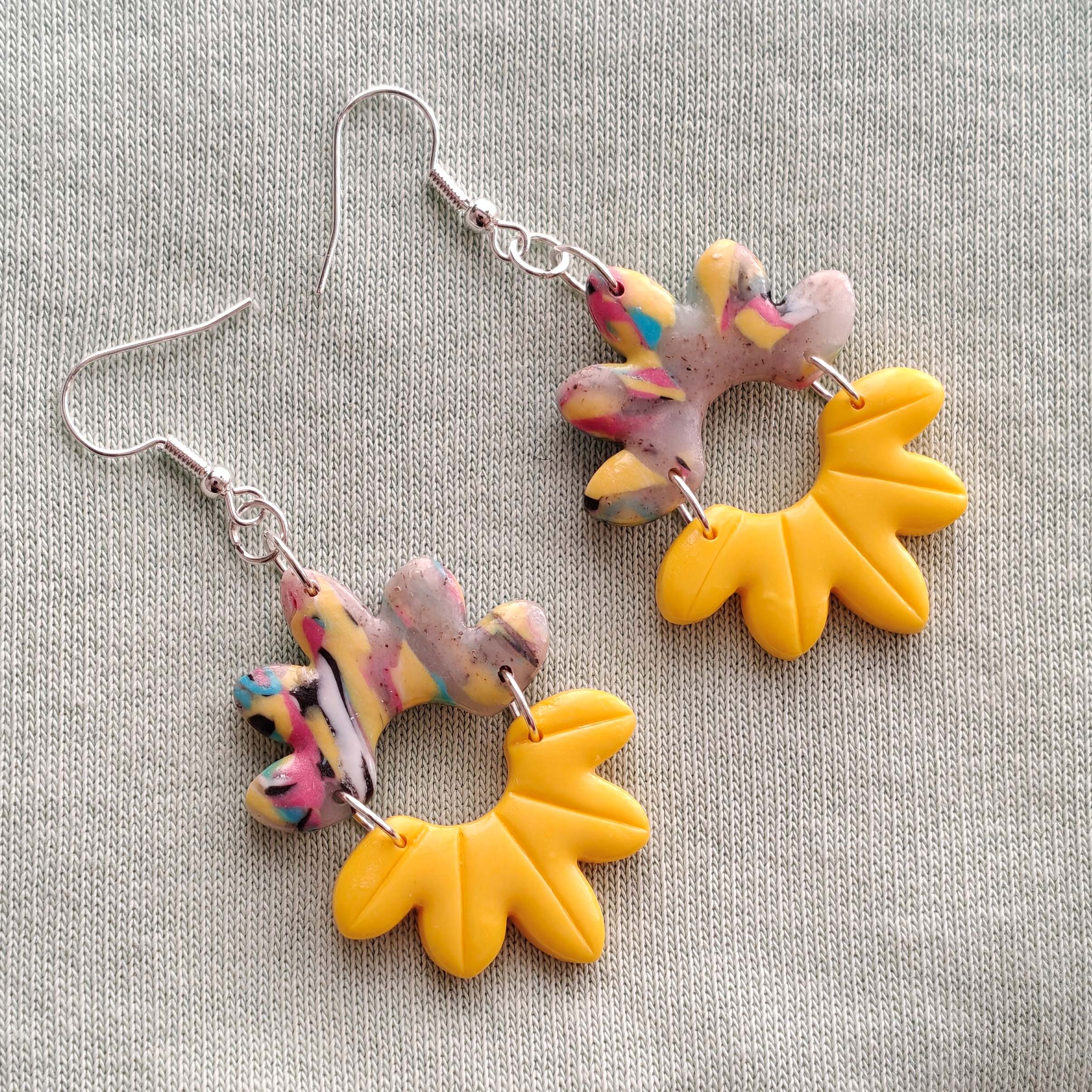 Korvakorut polymeerimassasta. Korun korkeus koukkuineen n. 6,5cm. Metalliosat hopeoitua messinkiä. Nikkelitön.