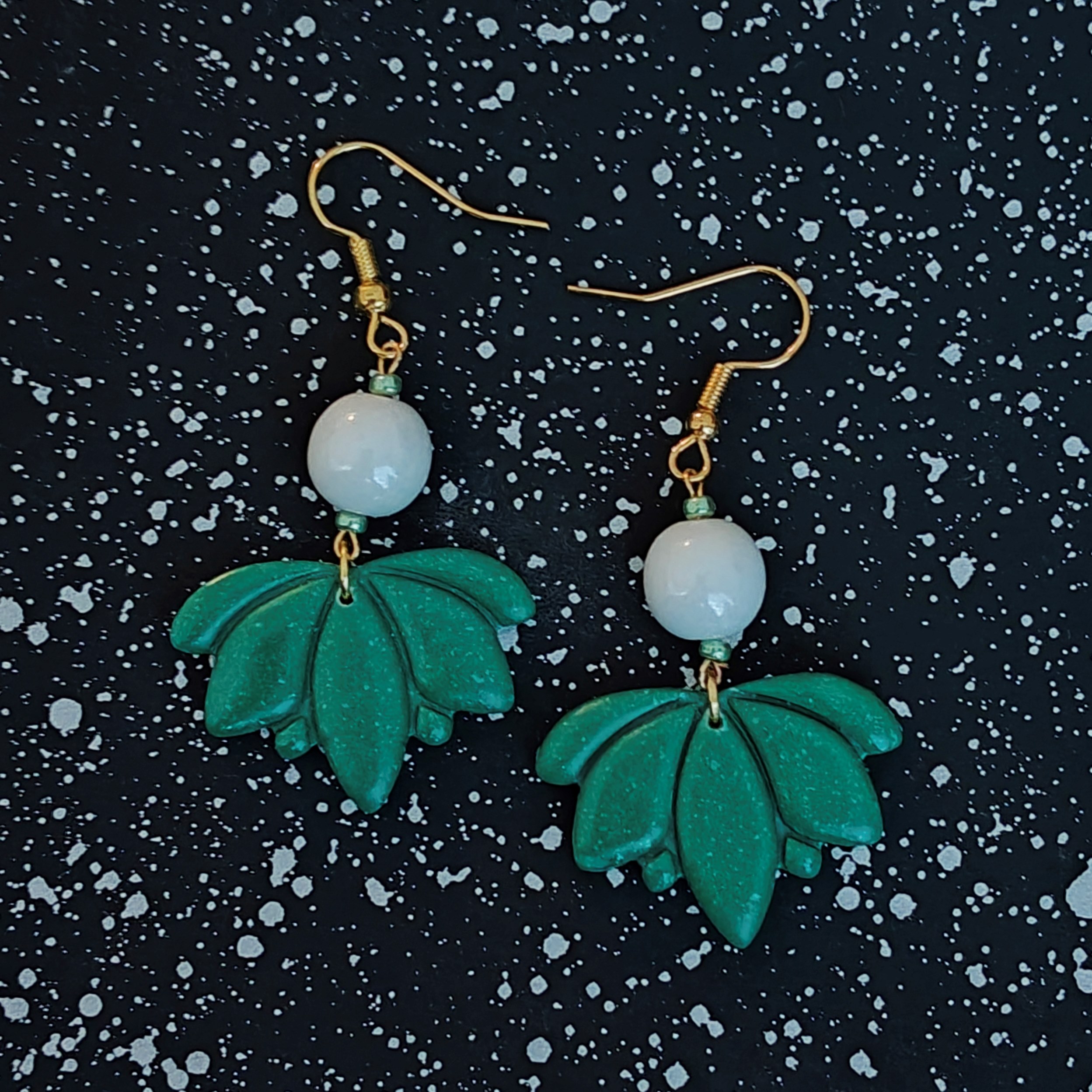 Korvakorut polymeerimassasta, lisänä lasihelmi. Koukut messinkiä. Korkeus koukun kanssa n. 5,5 cm.