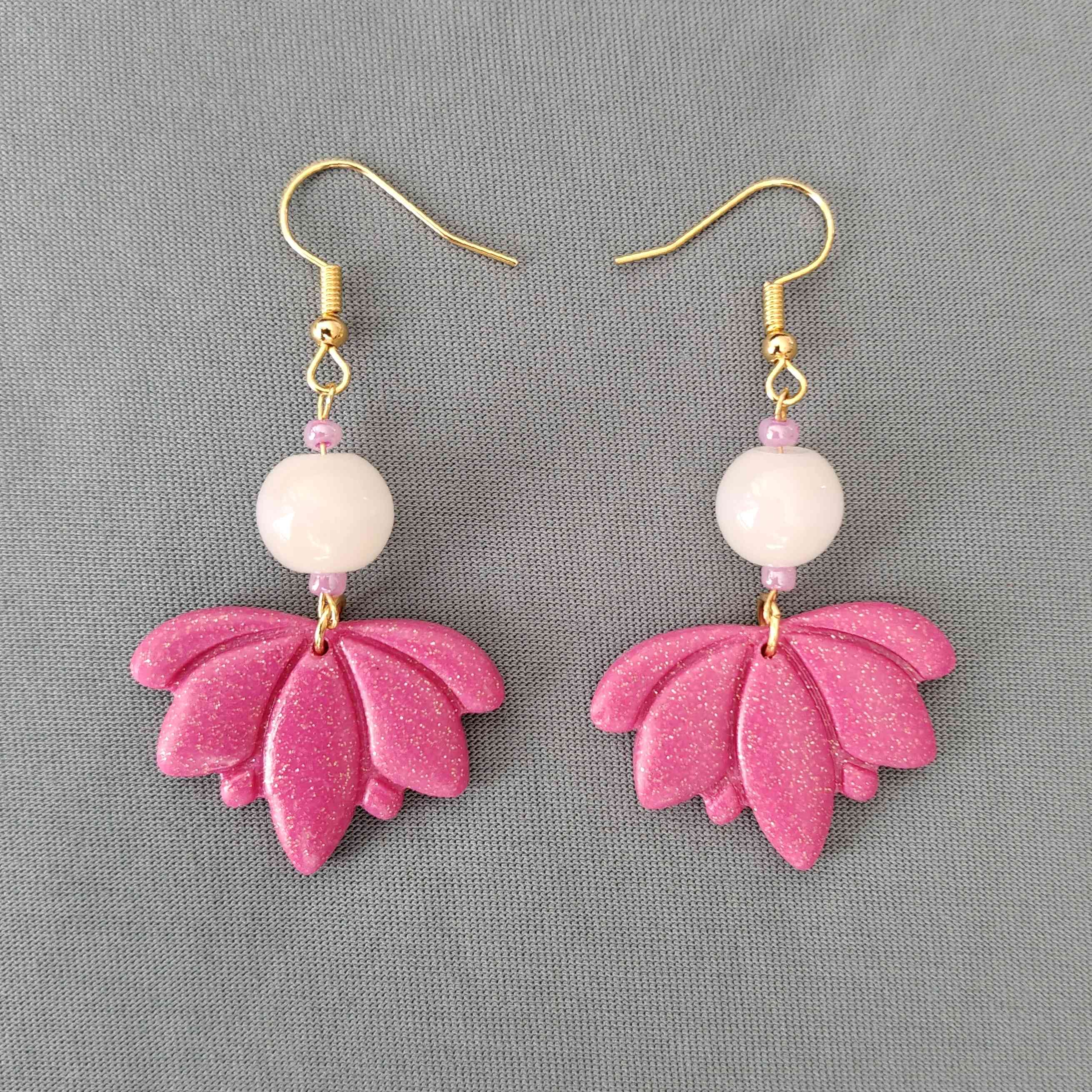 Kimaltelevat korvakorut polymeerimassasta ja kierrätyshelmistä, metalliosat kullanväristä rautaa. Korun korkeus koukun kanssa n. 6cm. Nikkelitön.