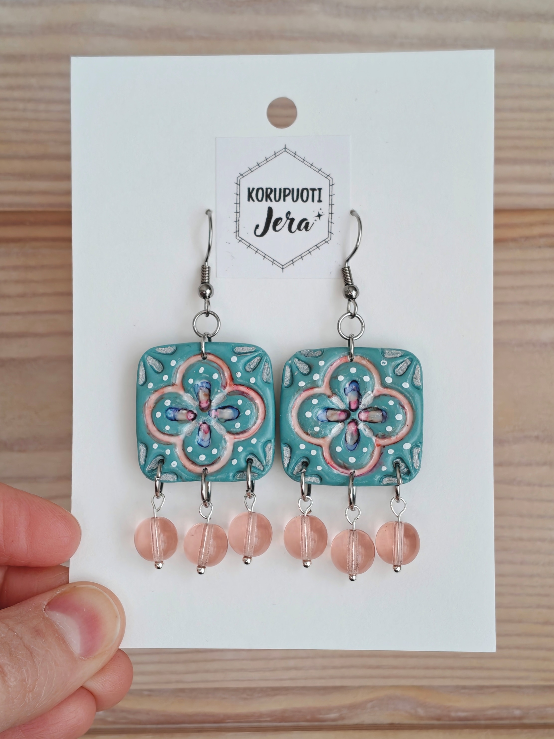 Korvakorut polymeerimassasta ja lasihelmistä. Korkeus koukun kanssa n. 6,5 cm. Koukku ruostumatonta terästä (rst304).
