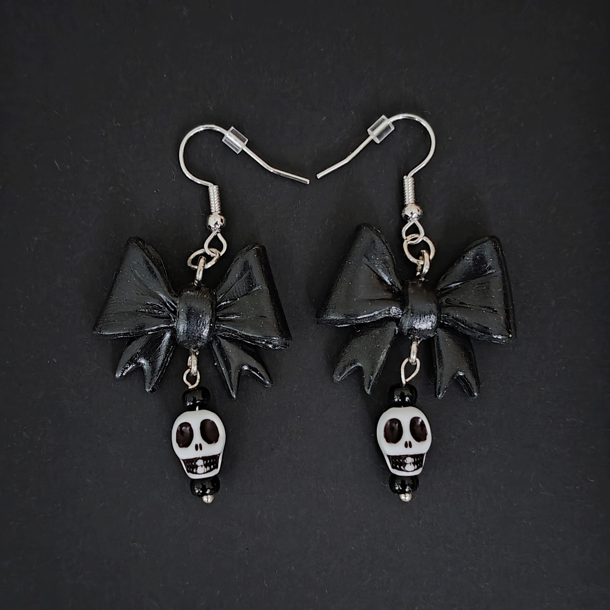 Korvakorut polymeerimassasta, helmet lasia ja akryylia. Korkeus koukun kanssa n. 6 cm. Metalliosat hopeoitua messinkiä, nikkelitön.