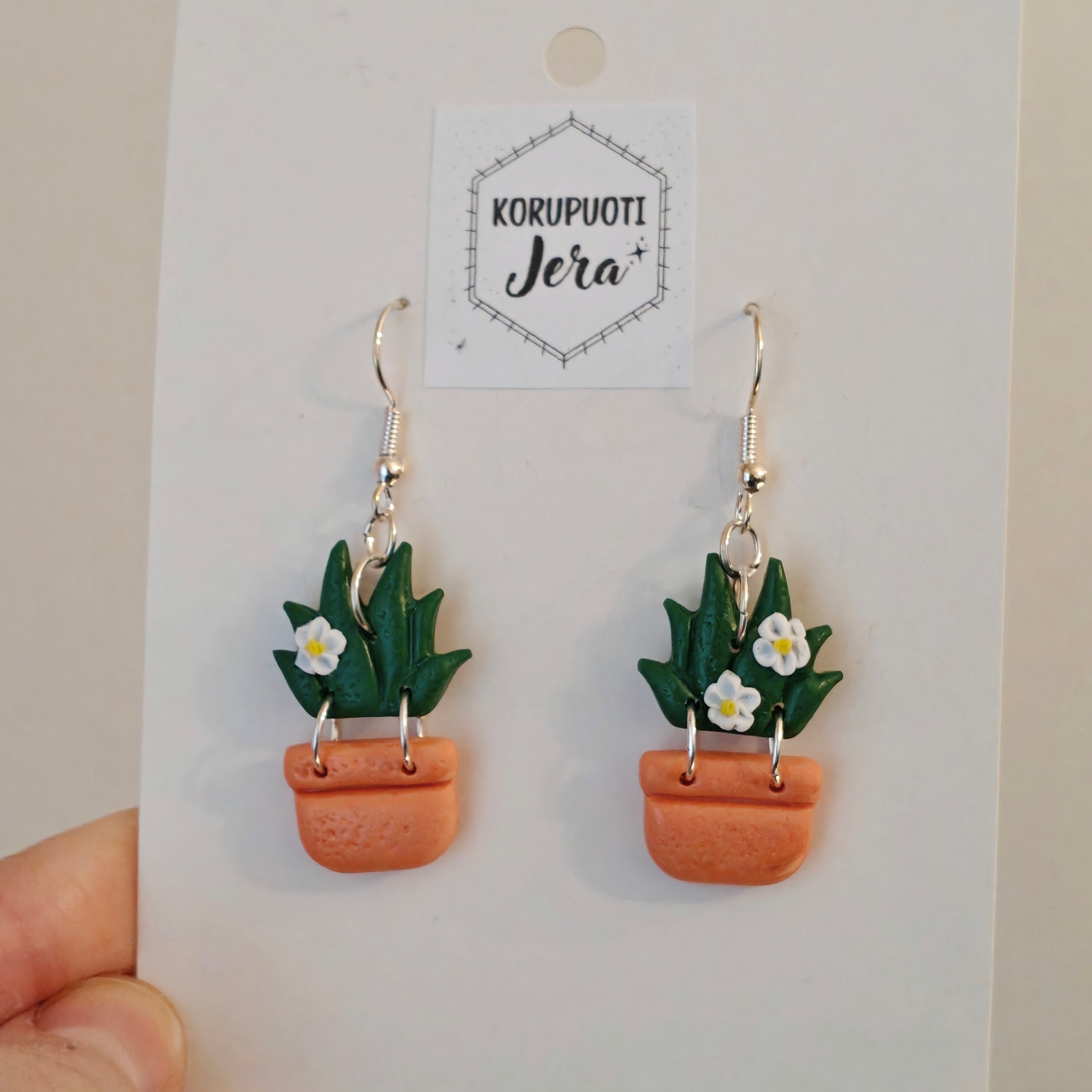 Polymeerimassasta valmistetut korvakorut. Korkeus koukkuineen n. 5 cm. Koukku messinkiä. Nikkelitön.