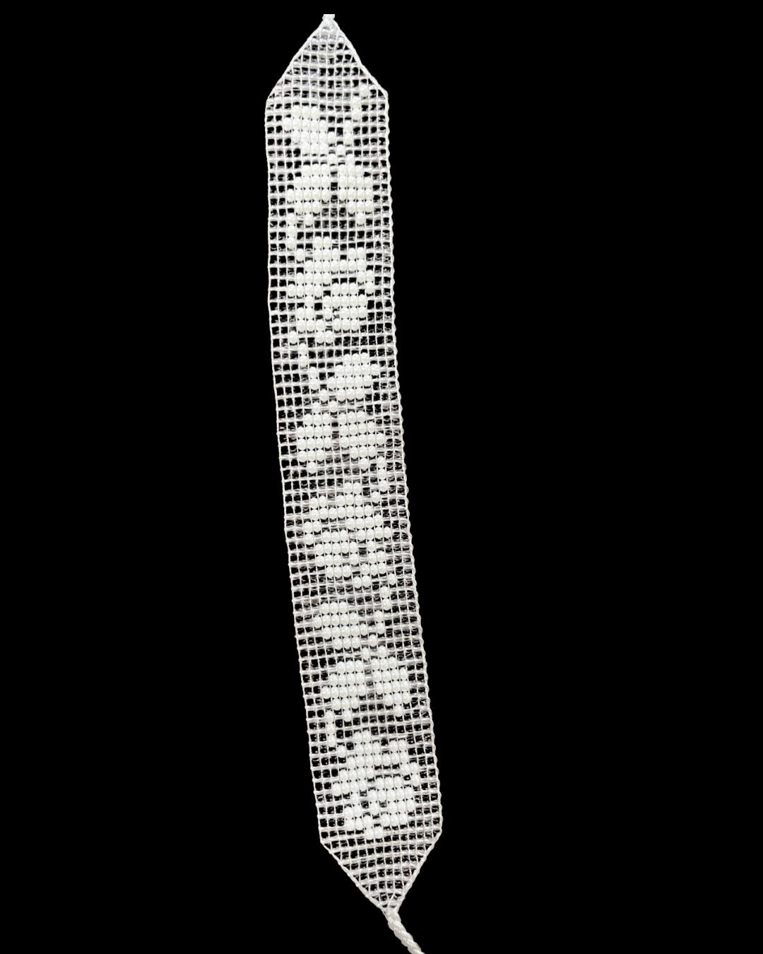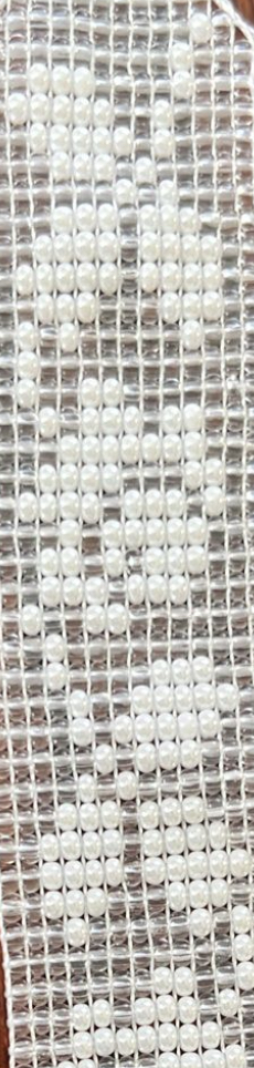 Meidän yhdistyksen kerhossa käsityönä tehty helmirannekoru. Pituus on säädettävä. Kirkkaiden helmien pohjalla, kuvio valkoisilla helmillä.