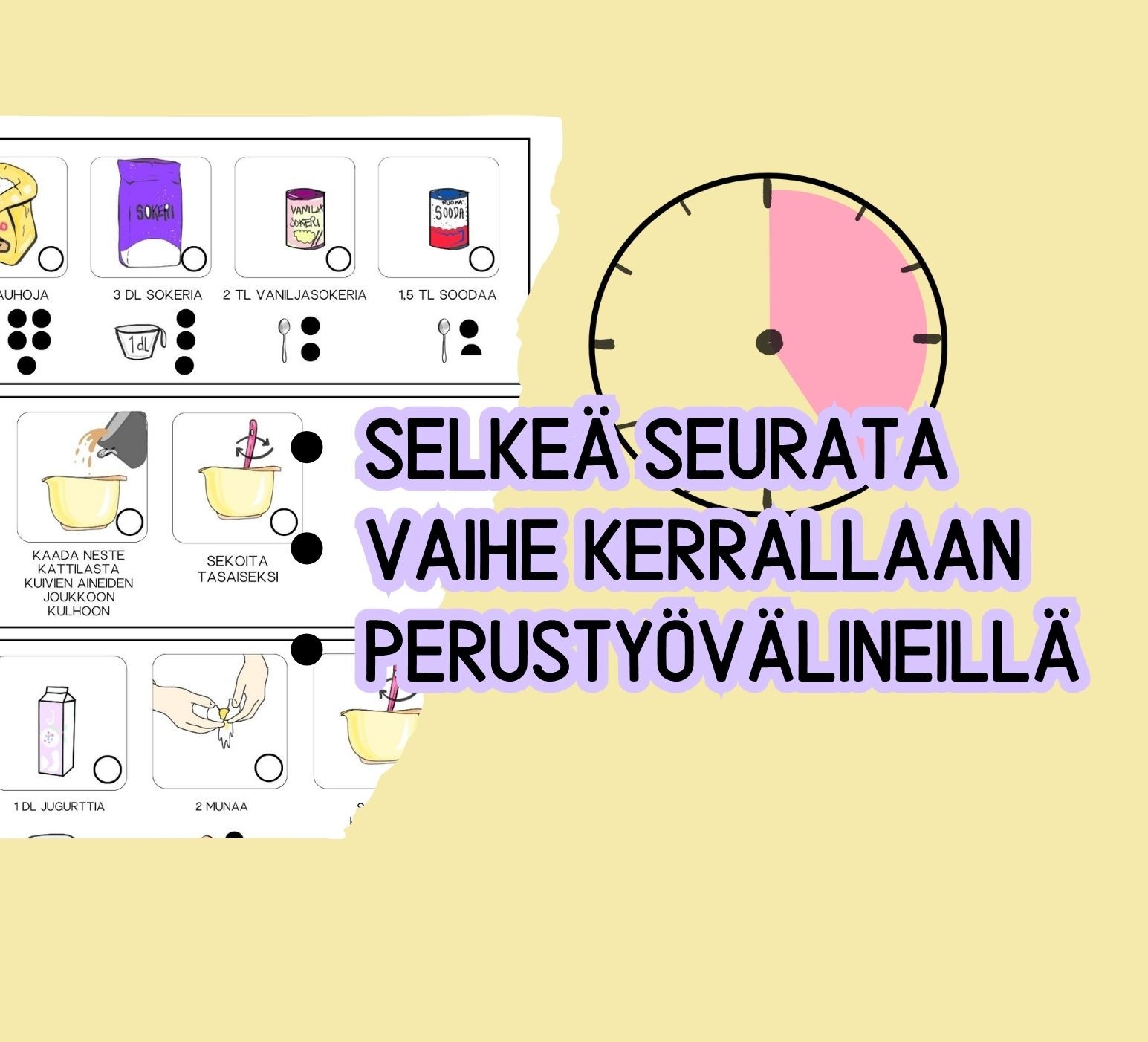Vaihekuvitettu leivonta helpottaa työhön ryhtymistä ja kokonaisuuden hahmottamista. Kuviin liitetyt check - merkinnät auttavat seuraamaan mitkä vaiheet on jo ohitettu. Ohjeissa on huomioitu myös työturvallisuus, eli uuni pois päältä. Ohjeet ovat kolmella-neljällä sivulla per resepti ja tarvitset väritulostimen. Nämä sopivat arjen opetteluun nuorelle, aikuiselle, kuntoutujalle ja lasten kanssa leivottaviksi, kunhan mukana on turvallinen aikuinen.