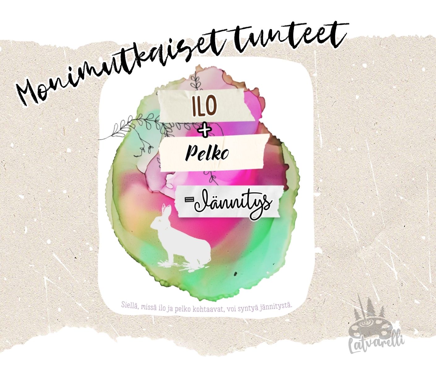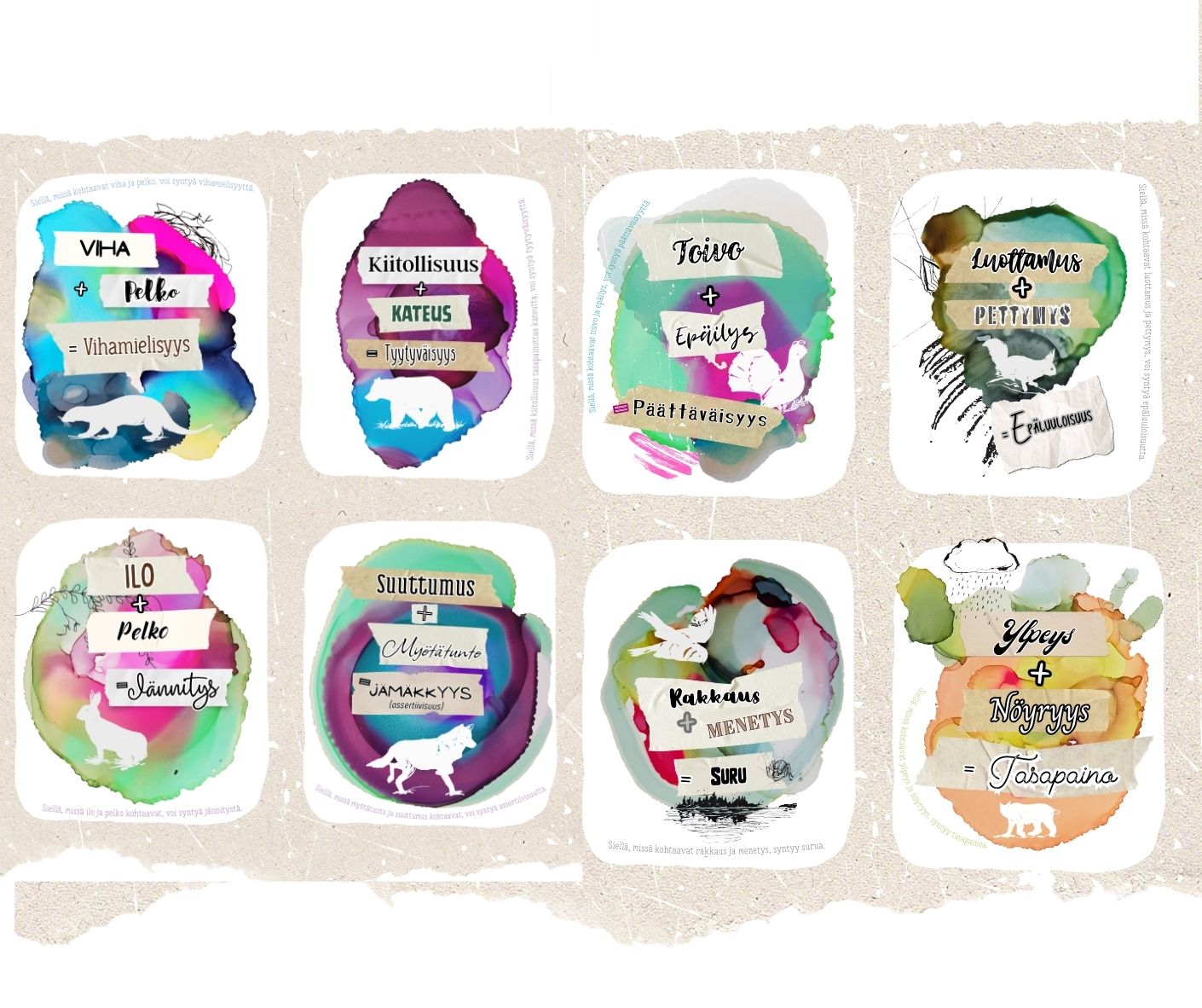Tunteet ovat monimutkaisia. Niitä herää useampia kerrallaan, kerroksittain ja päällekkäin. Jokin tunne voi vahvistaa toista, toinen taas tasapainottaa vastavoimaisena. Tutki korttien kuvia ja keskustele näistä tunneyhtälöistä: Tunnistatko yhteyksiä tai allekirjoitatko ehdotukset? Viimeisillä sivuilla on 20 yksinkertaista tunnesanakorttia. Voit asetella niitä rinnakkain ja tutkia keskustellen millaisia yhteyksiä mielessäsi herää, kun yhdistelet eri tunteita. Millaisia kokemuksia omasta elämästäsi nousee mieleen? Mitkä tunteet ovat vahvana sinussa?