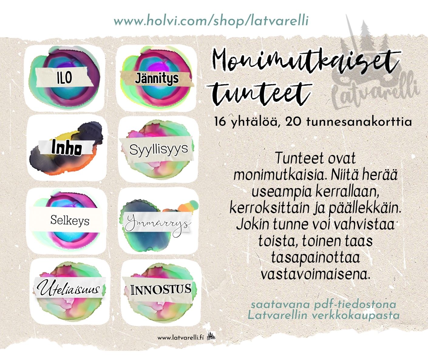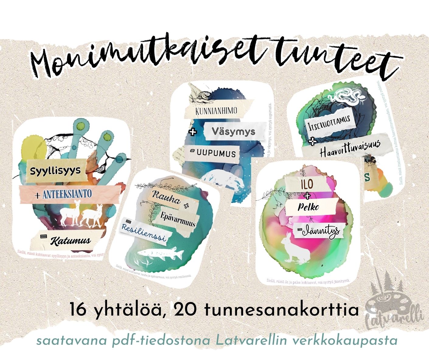 Monimutkaiset tunteetovat Latvarellin koostamia ja kuvittamia. Nämä kortit sopivat nuorille ja aikuisille ja tarvitset niiden käyttöön väritulostusmahdollisuuden. Korttien kuvatyyli löytyy tuotekuvista. Tunneyhtälöitä on yhteensä 16, tunnesanakortteja 20 ja sivuja koko pdf-setissä 9.