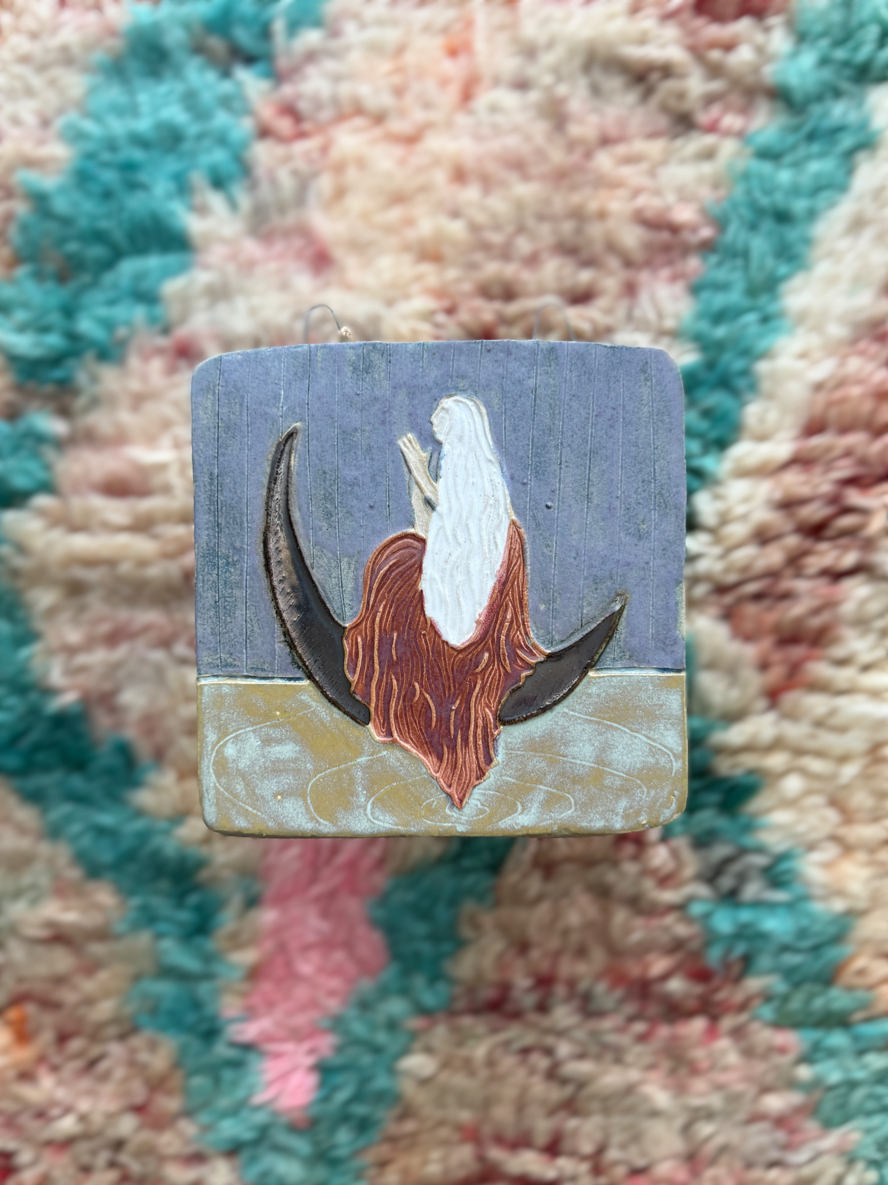 Luovuus-teoksessa hahmo istuu kuun päällä ja kohdistaa toiveensa luovaan voimaan. Kuun tumma, kaartuva muoto kehystää hahmoa ja luo teokseen suojaavan ja hieman mystisen tunnelman. Sinisenharmaa tausta yhdistyy hiekan ja vaalean okran sävyihin, ja hahmon valkea ja lämmin ruskea kontrasti korostaa keskittymistä ja sisäistä liikettä. Teos viittaa luovuuteen elämänvoimana – siihen, että jokainen on omalla tavallaan luova ja että luovuus ilmenee monissa muodoissa.