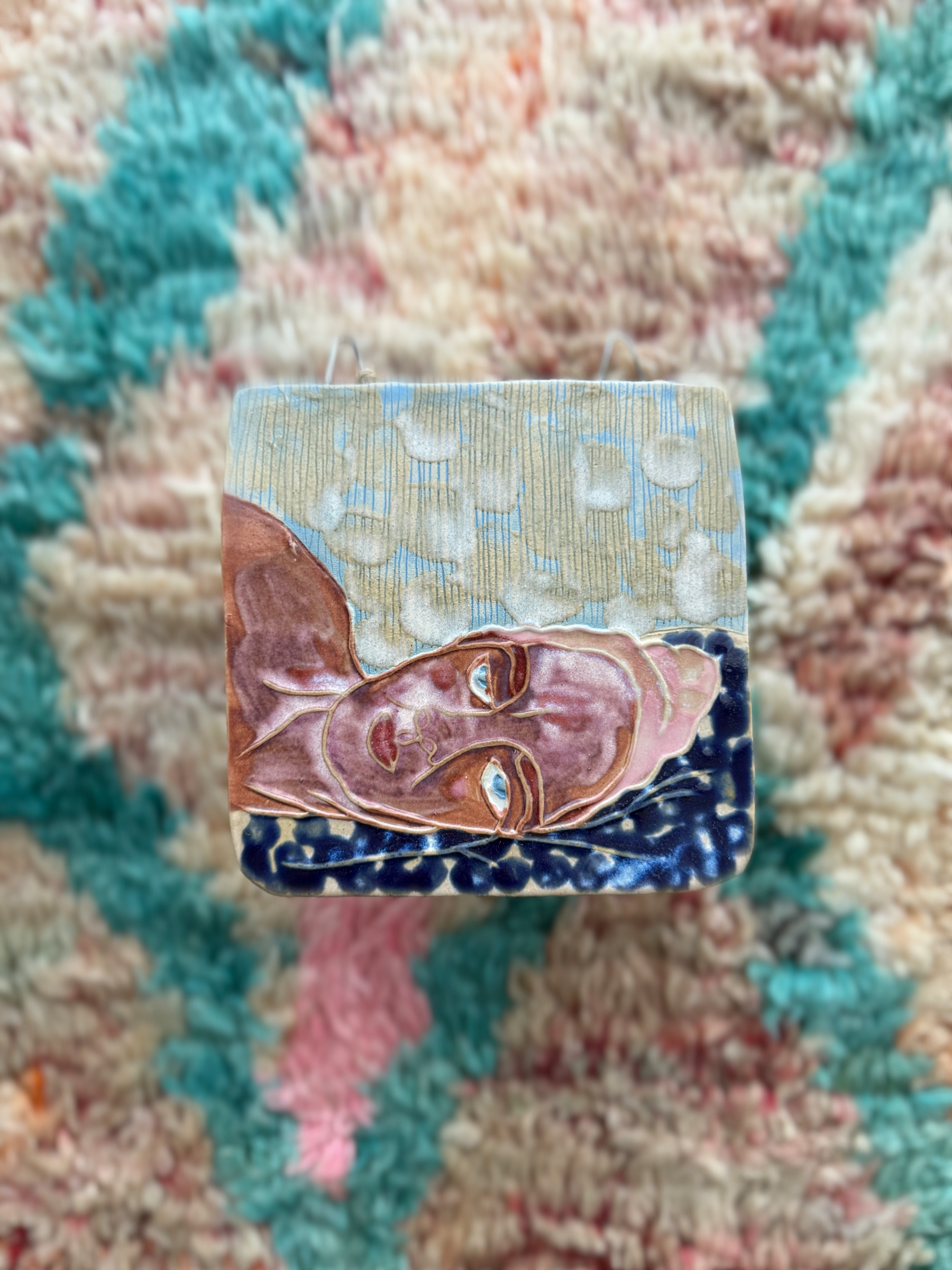 Hahmo on kuvattu makuulla silmät auki, katse rauhallisesti eteenpäin suuntautuneena. Valkoinen, puolipeittävä lasite antaa saven oman sävyn kuultaa läpi kasvojen roosan ja ruskean vivahteissa. Tummansininen, pilvimäinen pohja ja yläosan vaalea, käsin kaiverrettu pintakuvio luovat teokseen yönomaisen ja hieman jännittyneen tunnelman.