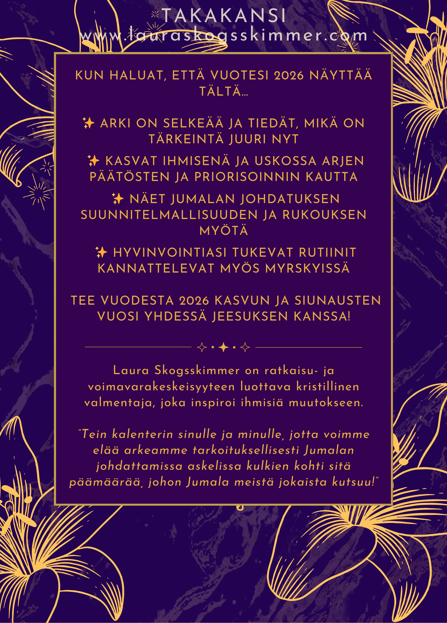 Tämä ei ole vain tavallinen kalenteri, vaan hengellinen valmennustyökalu, joka kulkee mukanasi vuoden jokaisena päivänä. Sen avulla et ainoastaan suunnittele aikatauluasi, vaan myös vahvistut uskossa, kasvat ihmisenä ja rakennat arkeesi rutiineja, jotka todella kantavat.
