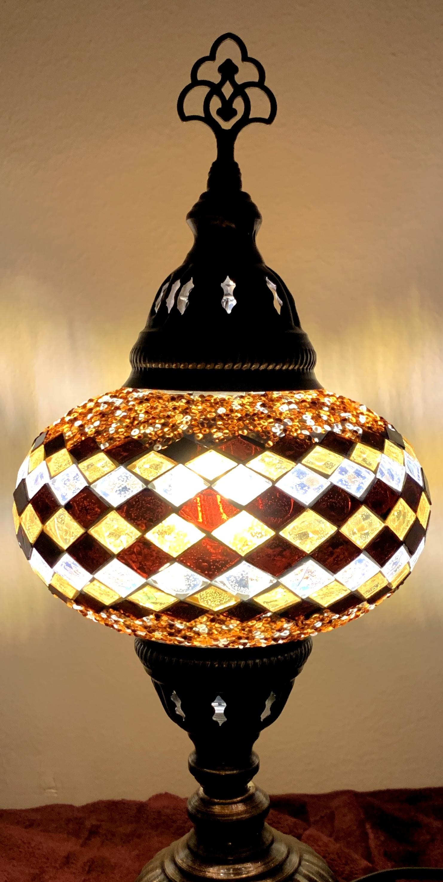 M-36 Käsityönä valmistettu mosaiikki pöytälamppu, metalliosa valmistetti messingistä, ei sisällä hehkulamppua E 14 Korkeus: 40 cm Leveys: 17 cm Paino: 900 gr