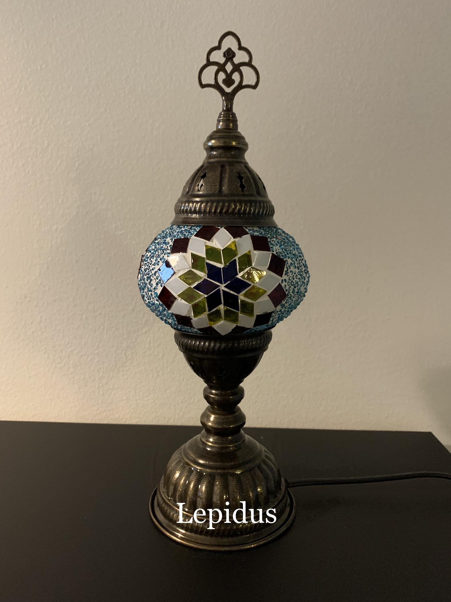 MU-12 Käsityönä valmisttettu mosaiikki pöytälampu, metalliosa valmistettu messingistä, E14 LED Lamppu 1,3W= 10W(90LM),lampun korkeus (Height) 58mm,leveys ( Width) 26mm. SISÄLLÄ EI LAMPPU Korkeus ( Height)= 33 cm Leveys ( Width)= 10 cm Paino (Weight )= 700 gr