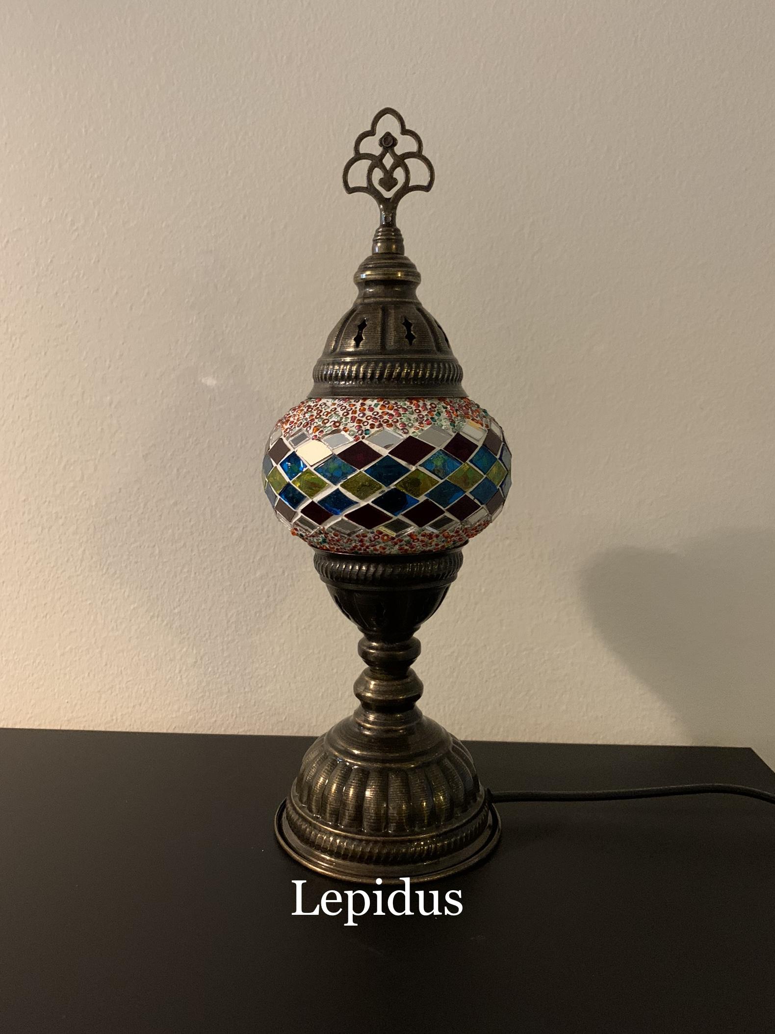 MU-11 Käsityönä valmistettu mosaiikki pöytälamppu. Metalliosa valmistettu messingistä, E14 LED Lamppu 1,3W=10W(90LM),lampun korkeus (Height) 58mm,leveys( Width) 26mm. SISÄLLÄ EI LAMPPU Korkeus [ Height]= 33cm Leveys [ Width]= 10 cm Paino [Weight]= 700 gr