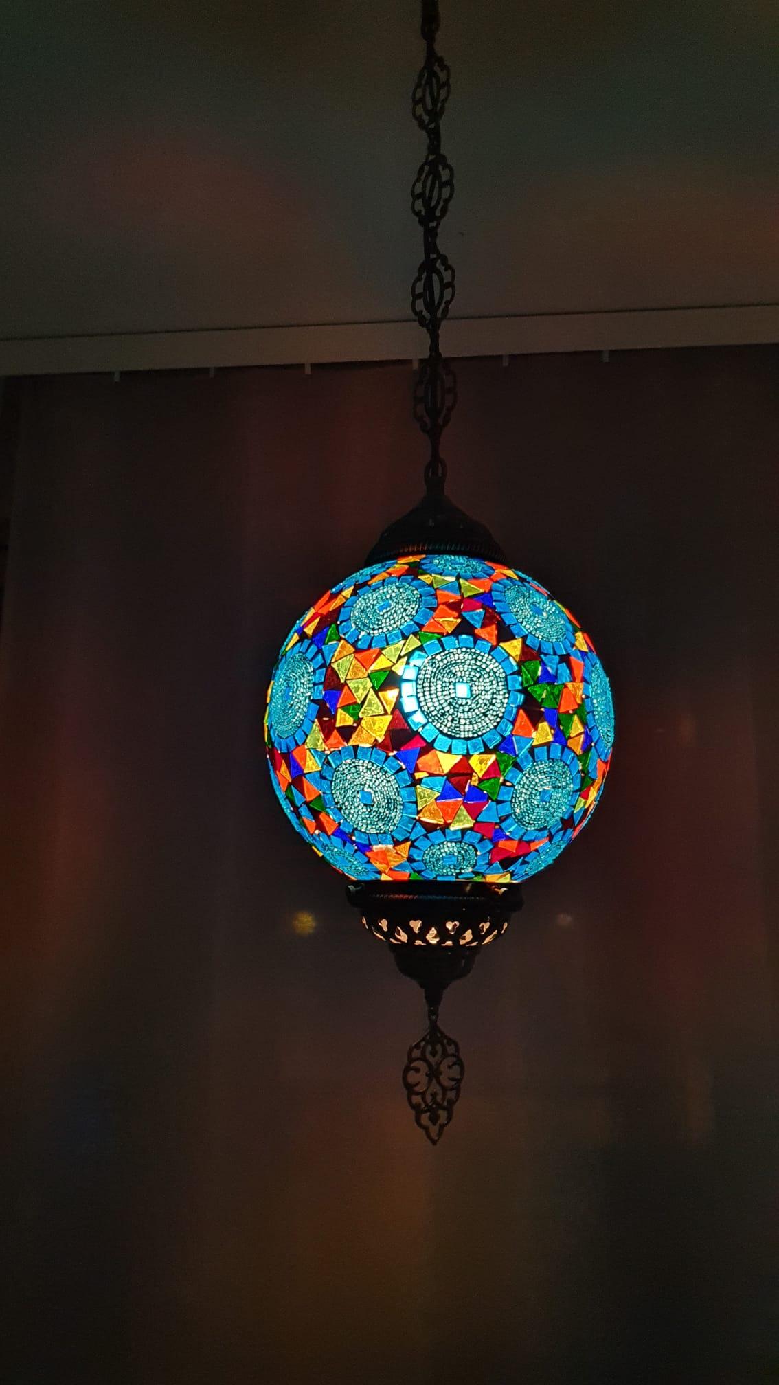 Sininen iso lasipallo käsityönä valmistettu mosaiikki kattolamppu. metalliosa valmisatettu messingistä, ei sisallä hehkulampua E27. Pallon koko on korkeus 39 cm ja leveys 25 cm,pallon ympärysmitta 81 cm,lamppu pidikkeen kanssa pituus n. 97 cm [ Katosta ]