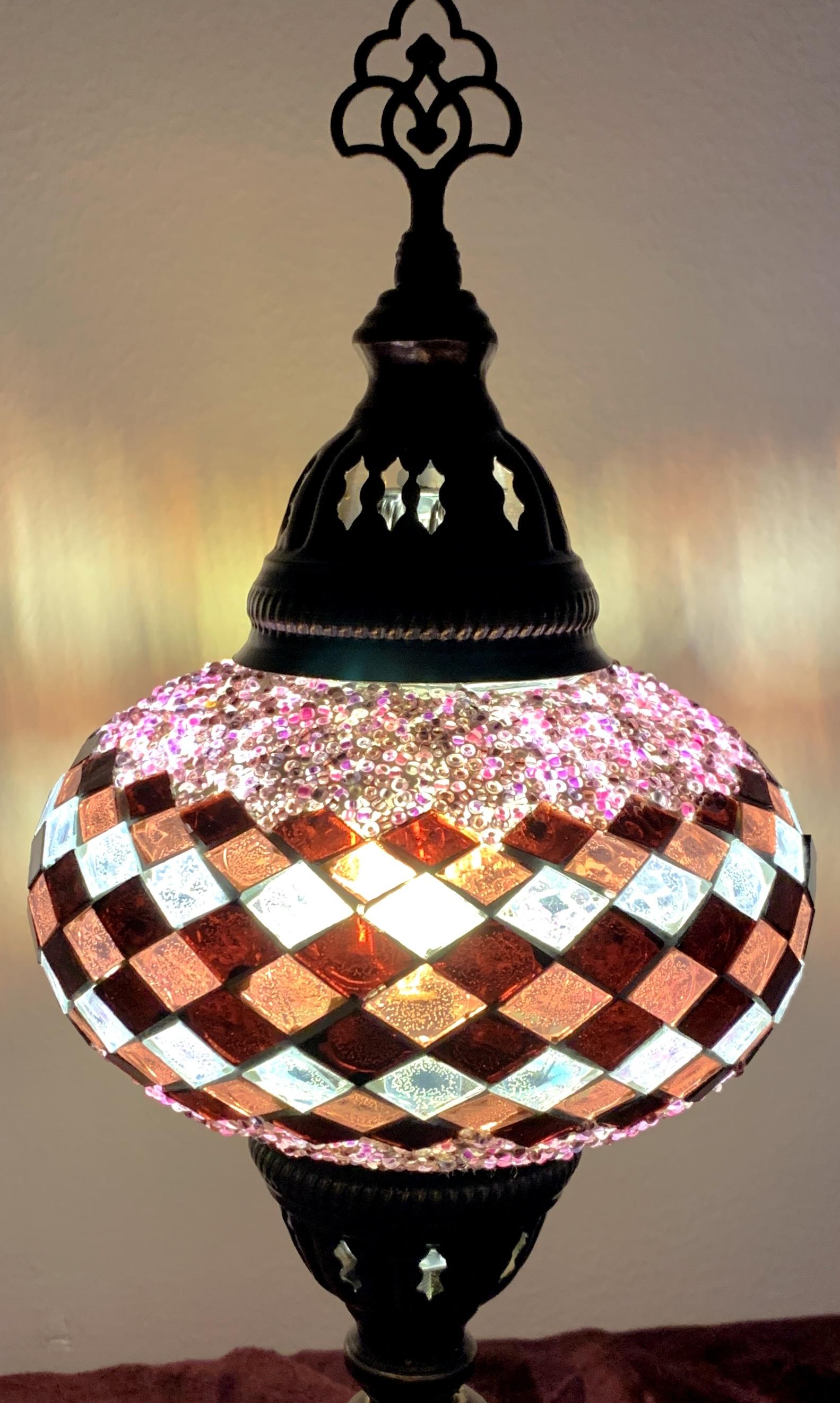 M-34 Käsityönä valmistettu mosaiikki pöytälamppu.metalliosa valmistettu messingistä, ei sisällä hehkulamppua E14 Korkeus: 40 cm Leveys: 17 cm Paino: 900 gr