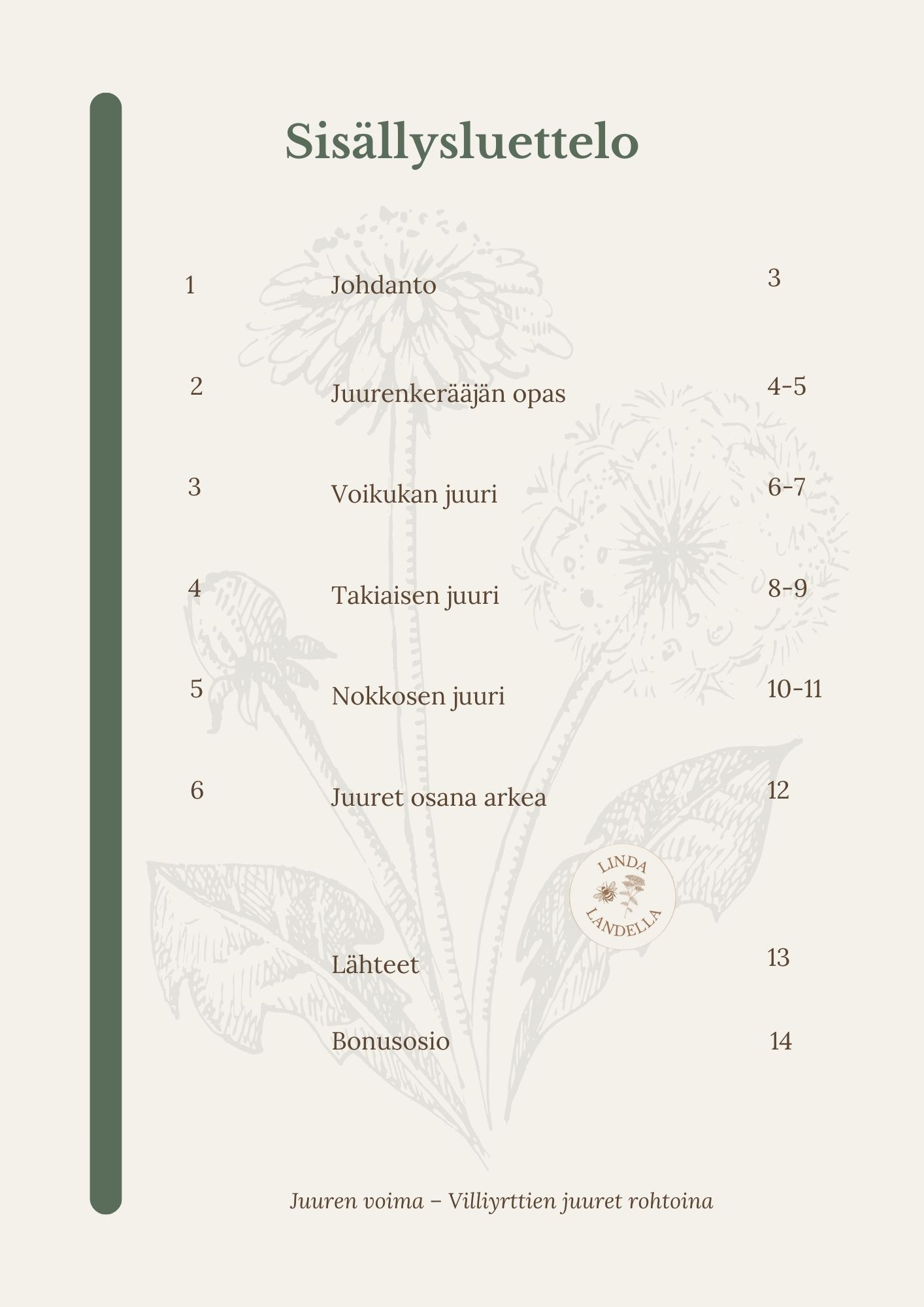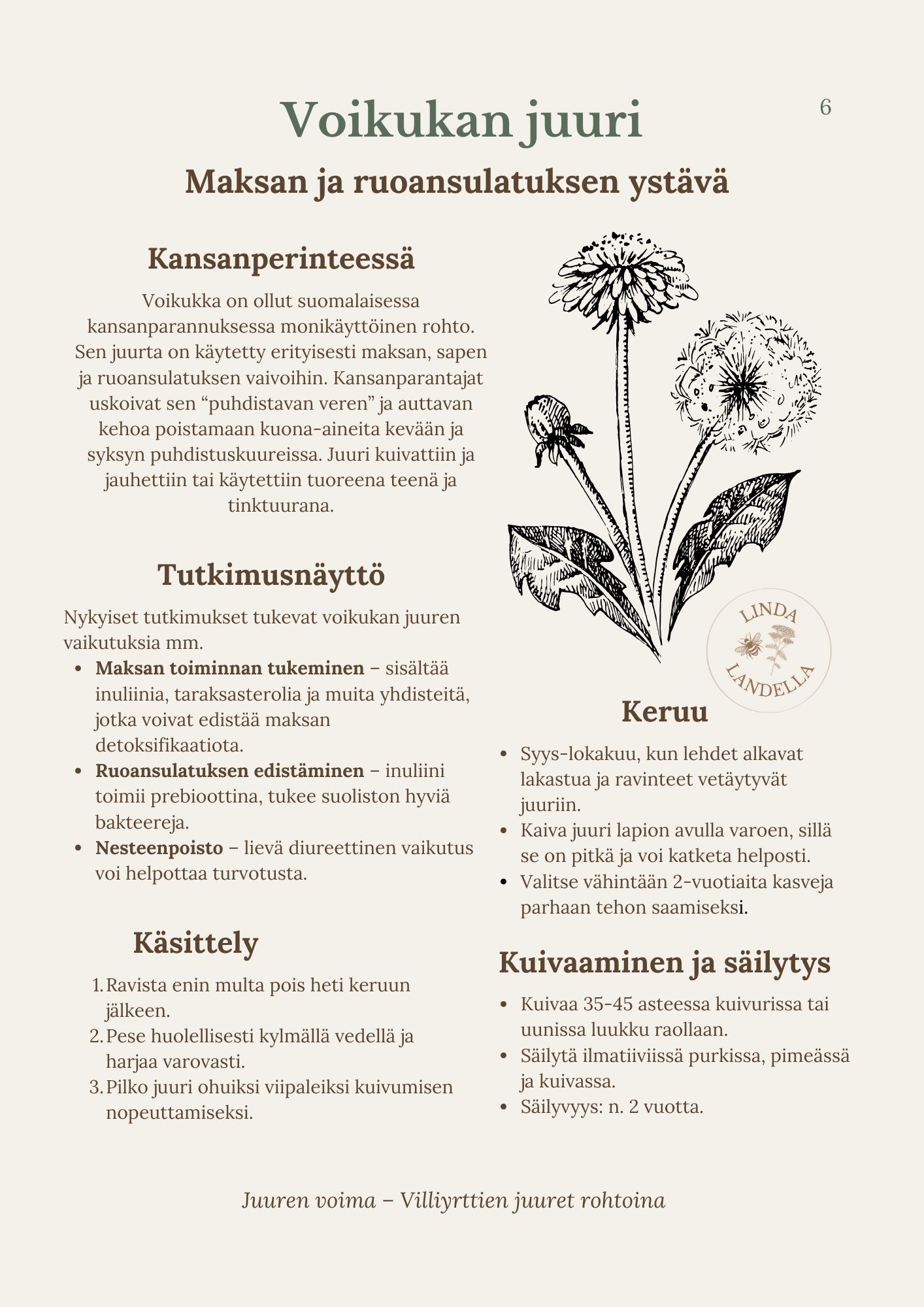 Tämä 14-sivuinen opas johdattaa sinut suomalaisen luonnon ikiaikaisiin juuriin. Esittelen oppaassa kolme eniten käytettyä juurta – voikukan, takiaisen ja nokkosen juuret (+ bonusosio). Saat käytännön ohjeet keruuseen, käsittelyyn ja säilytykseen sekä tiedon siitä, mihin vaivoihin juuria on perinteisesti käytetty ja mitä tutkimukset niistä kertovat.