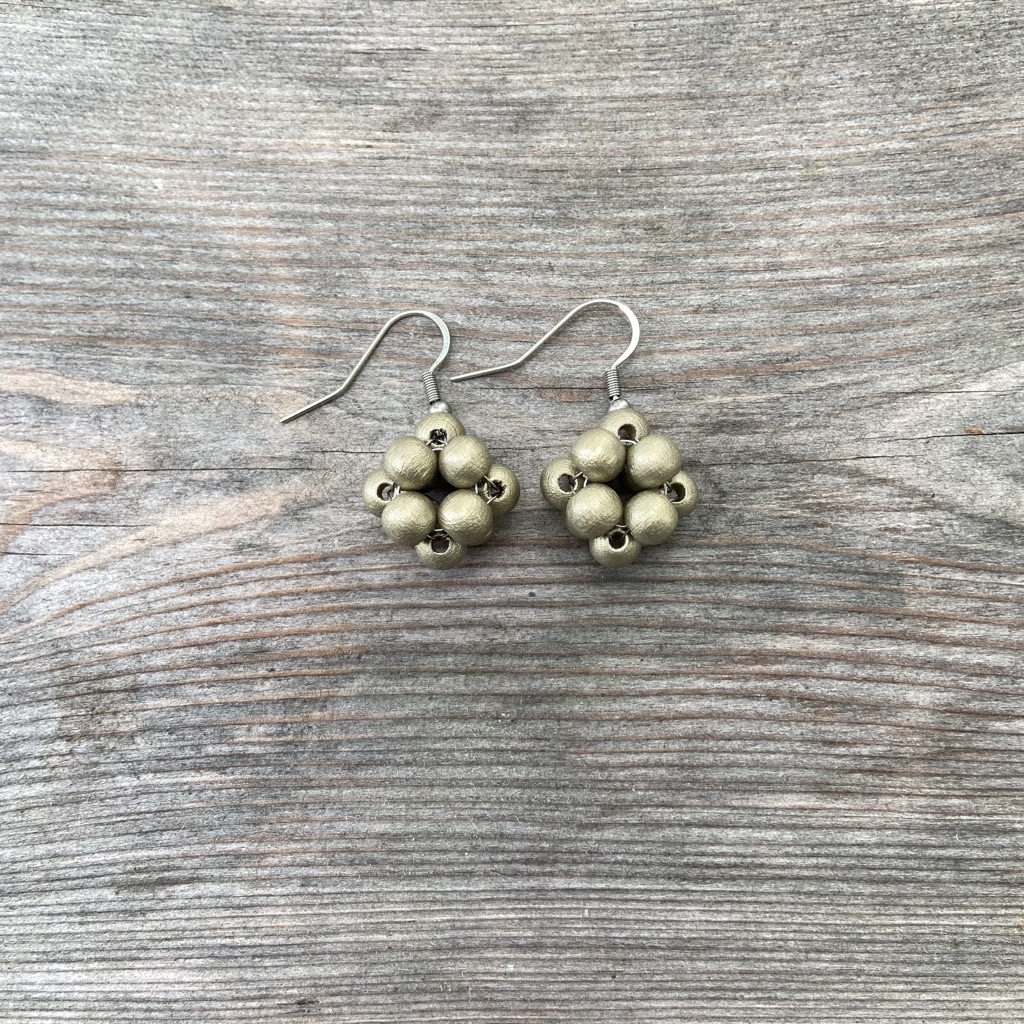 Puuhelmistä ja metallilangasta punottujen Terttu-korvakorujen muoto muistuttaa puutarhan vadelmia tai pientä kourallista viinimarjoja. Puuhelmet ovat maalattuja ja lakattuja. Koukuissa on käytetty nikkelivapaata metallilankaa. Korvakorujen halkaisija on n. 2 cm ja korkeus koukun kanssa n. 3,3 cm. Korvakorupari on kiinnitetty uusiokartonkiseen tuotelappuun.