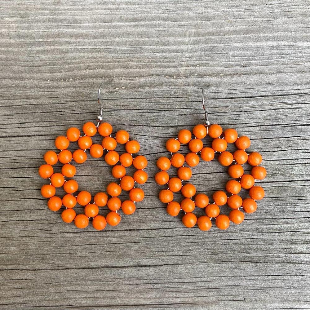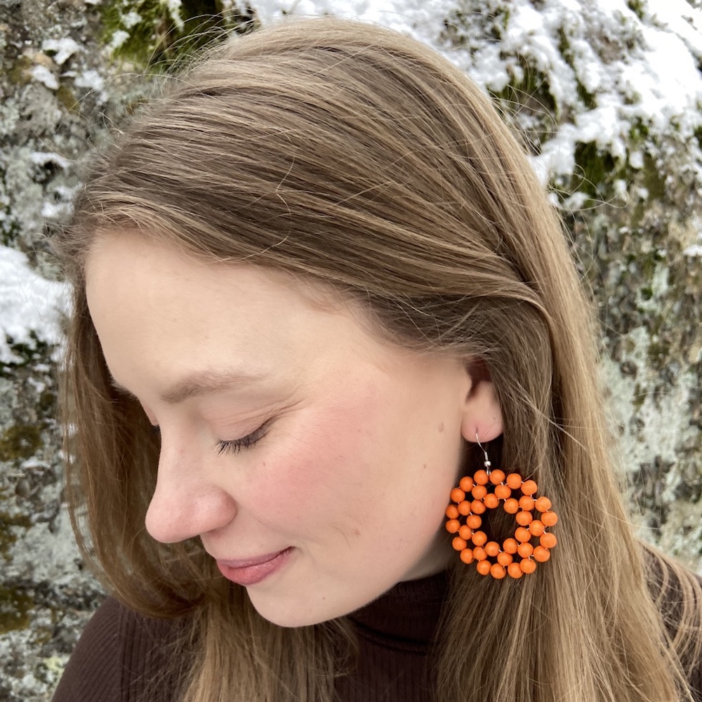 Näyttävien puuhelmistä ja metallilangasta valmistettujen Kehrä-korvakorujen muoto muistuttaa auringon kehrää tai kukkaa terälehtineen. Puuhelmet ovat maalattuja ja lakattuja. Koukuissa on käytetty nikkelivapaata metallilankaa. Korvakorujen pituus koukun kanssa on n. 6 cm ja ympyrän halkaisija on n. 4,8 cm. Korvakorupari on kiinnitetty uusiokartonkiseen tuotelappuun.