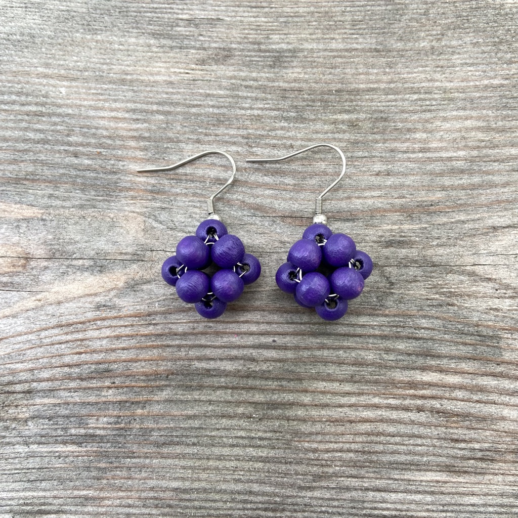 Puuhelmistä ja metallilangasta punottujen Terttu-korvakorujen muoto muistuttaa puutarhan vadelmia tai pientä kourallista viinimarjoja. Puuhelmet ovat maalattuja ja lakattuja. Koukuissa on käytetty nikkelivapaata metallilankaa. Korvakorujen halkaisija on n. 2 cm ja korkeus koukun kanssa n. 3,3 cm. Korvakorupari on kiinnitetty uusiokartonkiseen tuotelappuun.