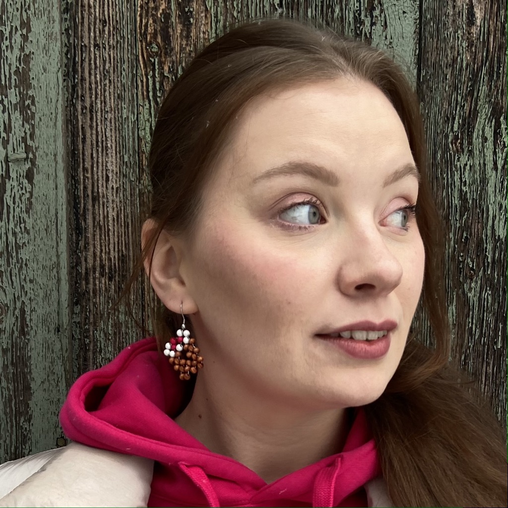 Pienistä puuhelmistä ja metallilangasta käsityönä punotut Runebergintorttu-korvakorut ovat herkullisen näköiset. Yleensä tortuista voi nauttia vain pienen hetken, nämä Runebergintortut ilahduttavat pitkään. Koruissa on käytetty maalattuja ja lakattuja eurooppalaisia puuhelmiä. Koukut ovat kirurginterästä. Korvakorujen leveys on 2,2 cm ja korkeus ilman koukkua n. 3 cm. Korvakorupari on kiinnitetty uusiokartonkiseen tuotelappuun.