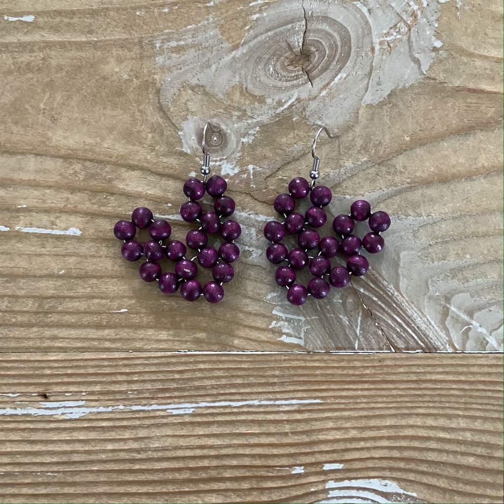 Rakkautta on-korvakorut rakkaalle, itselle, ystävälle! Puuhelmistä ja metallilangasta punottujen Rakkautta on-korvakorujen helmet ovat maalattuja ja lakattuja. Koukuissa on käytetty kirurginterästä. Korvakorujen pituus koukun kanssa on n. 5 cm ja leveys n. 3,5 cm. Korvakorupari on kiinnitetty uusiokartonkiseen tuotelappuun.