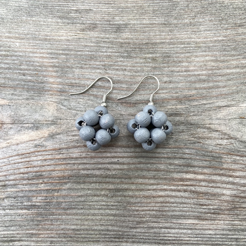 Puuhelmistä ja metallilangasta punottujen Terttu-korvakorujen muoto muistuttaa puutarhan vadelmia tai pientä kourallista viinimarjoja. Puuhelmet ovat maalattuja ja lakattuja. Koukuissa on käytetty nikkelivapaata metallilankaa. Korvakorujen halkaisija on n. 2 cm ja korkeus koukun kanssa n. 3,3 cm. Korvakorupari on kiinnitetty uusiokartonkiseen tuotelappuun.