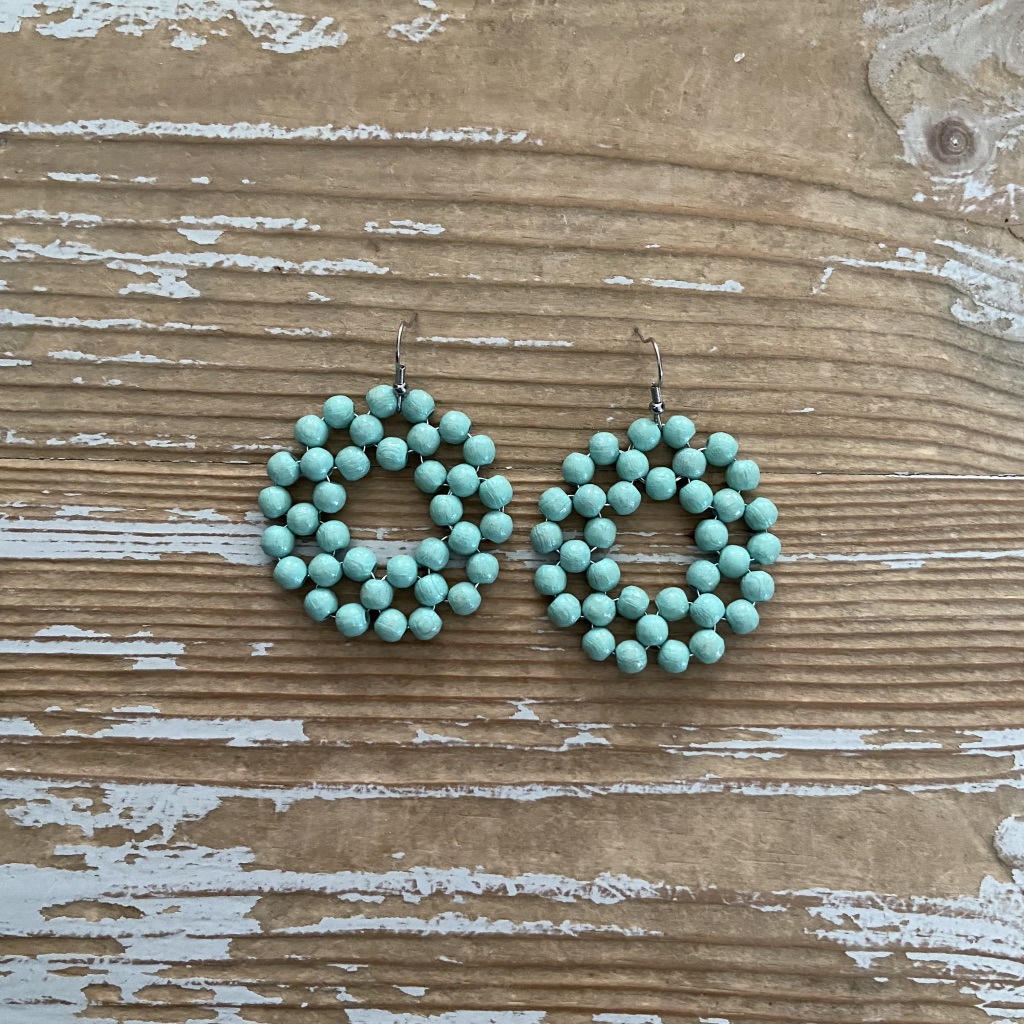Näyttävien puuhelmistä ja metallilangasta valmistettujen Kehrä-korvakorujen muoto muistuttaa auringon kehrää tai kukkaa terälehtineen. Puuhelmet ovat maalattuja ja lakattuja. Koukuissa on käytetty kirurginterästä. Korvakorujen pituus koukun kanssa on n. 6 cm ja ympyrän halkaisija on n. 4,8 cm. Korvakorupari on kiinnitetty uusiokartonkiseen tuotelappuun.