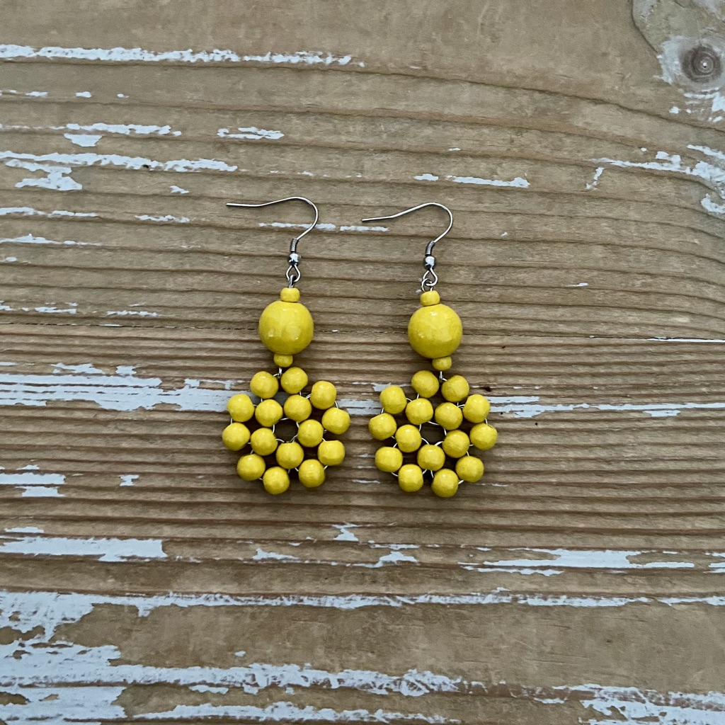 Puuhelmistä ja metallilangasta punottujen Flora-korvakorujen muoto muistuttaa kukkaa tai käpyä. Puuhelmet ovat maalattuja ja lakattuja. Korvakorujen metalliosat ovat kirurgin terästä ja koruteräslankaa. Korujen halkaisija on n. 25 mm ja Floran korkeus on n. 50 mm + koukku. Korvakorupari on kiinnitetty uusiokartonkiseen tuotelappuun.