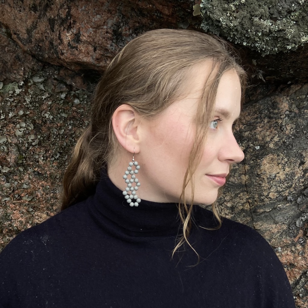 Kukinnot on nyt uusi, näyttävämpi juhlakorvakoru. Puuhelmistä ja metallilangasta punotuissa Kukinnot-korvakoruissa pienet kukat muodostavat kaartelevan kukkajonon. Puuhelmet ovat maalattuja ja lakattuja. Koukuissa on käytetty kirurginterästä. Korvakorujen pituus koukun kanssa on n. 8 cm ja leveys n. 1,8 cm. Korvakorupari on kiinnitetty uusiokartonkiseen tuotelappuun.