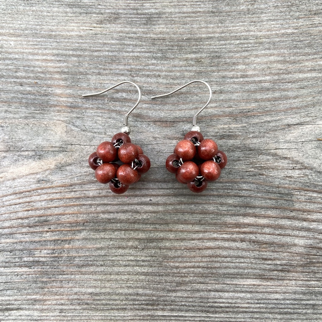 Puuhelmistä ja metallilangasta punottujen Terttu-korvakorujen muoto muistuttaa puutarhan vadelmia tai pientä kourallista viinimarjoja. Puuhelmet ovat maalattuja ja lakattuja. Koukuissa on käytetty nikkelivapaata metallilankaa. Korvakorujen halkaisija on n. 2 cm ja korkeus koukun kanssa n. 3,3 cm. Korvakorupari on kiinnitetty uusiokartonkiseen tuotelappuun.