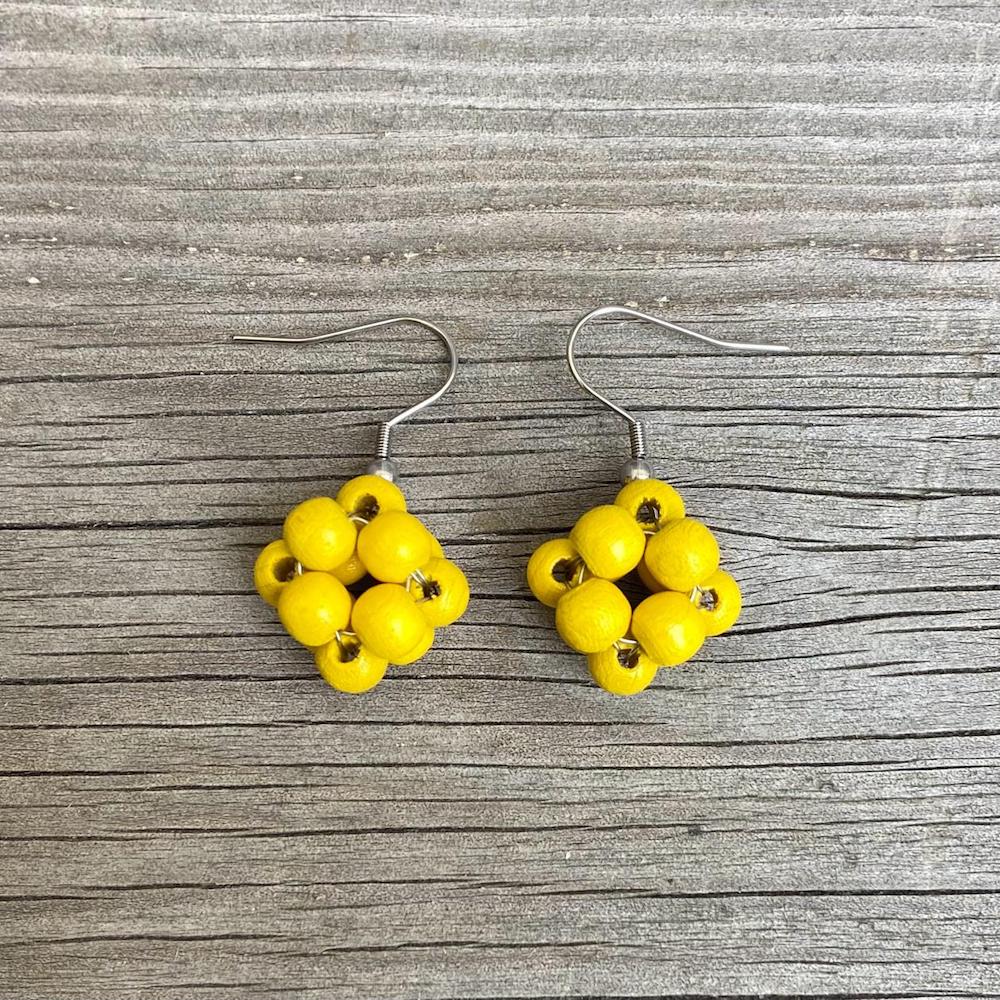 Puuhelmistä ja metallilangasta punottujen Terttu-korvakorujen muoto muistuttaa puutarhan vadelmia tai pientä kourallista viinimarjoja. Puuhelmet ovat maalattuja ja lakattuja. Koukuissa on käytetty kirurginterästä. Korvakorujen halkaisija on n. 2 cm ja korkeus koukun kanssa n. 3,3 cm. Korvakorupari on kiinnitetty uusiokartonkiseen tuotelappuun.