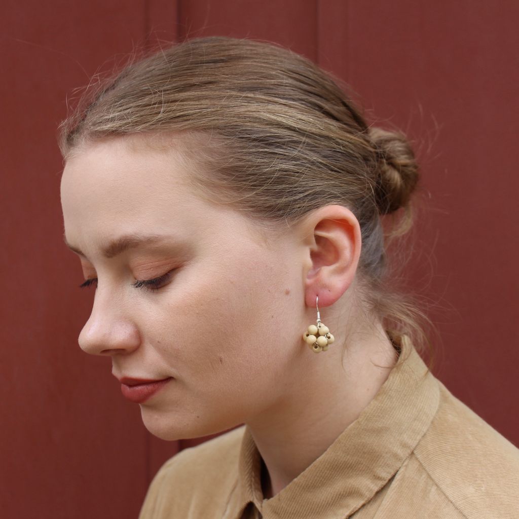 Puuhelmistä ja metallilangasta punottujen Terttu-korvakorujen muoto muistuttaa puutarhan vadelmia tai pientä kourallista viinimarjoja. Puuhelmet ovat maalattuja ja lakattuja. Koukuissa on käytetty nikkelivapaata metallilankaa. Korvakorujen halkaisija on n. 2 cm ja korkeus koukun kanssa n. 3,3 cm. Korvakorupari on kiinnitetty uusiokartonkiseen tuotelappuun.