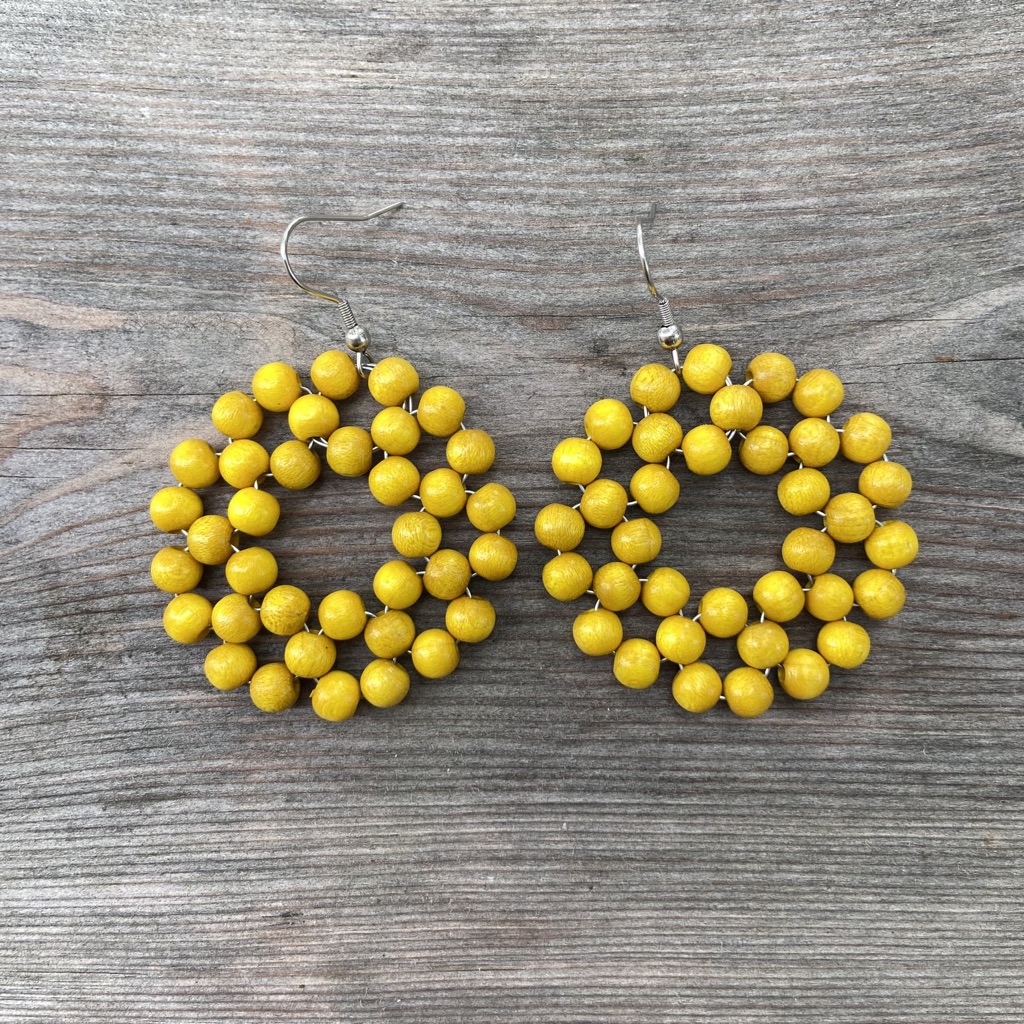 Näyttävien puuhelmistä ja metallilangasta valmistettujen Kehrä-korvakorujen muoto muistuttaa auringon kehrää tai kukkaa terälehtineen. Puuhelmet ovat maalattuja ja lakattuja. Koukuissa on käytetty nikkelivapaata metallilankaa. Korvakorujen pituus koukun kanssa on n. 6 cm ja ympyrän halkaisija on n. 4,8 cm. Korvakorupari on kiinnitetty uusiokartonkiseen tuotelappuun.