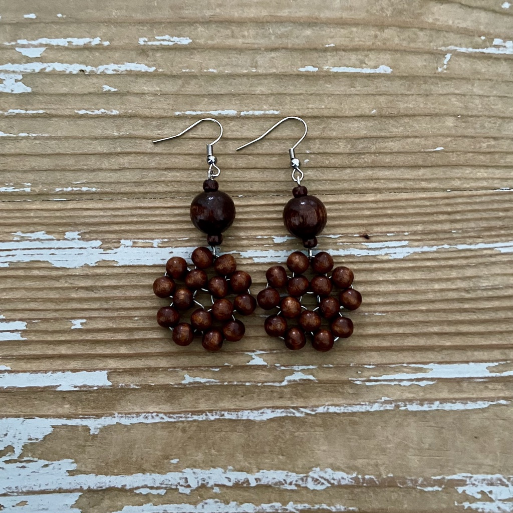 Puuhelmistä ja metallilangasta punottujen Flora-korvakorujen muoto muistuttaa kukkaa tai käpyä. Puuhelmet ovat maalattuja ja lakattuja. Korvakorujen metalliosat ovat kirurgin terästä ja koruteräslankaa. Korujen halkaisija on n. 25 mm ja Floran korkeus on n. 50 mm + koukku. Korvakorupari on kiinnitetty uusiokartonkiseen tuotelappuun.
