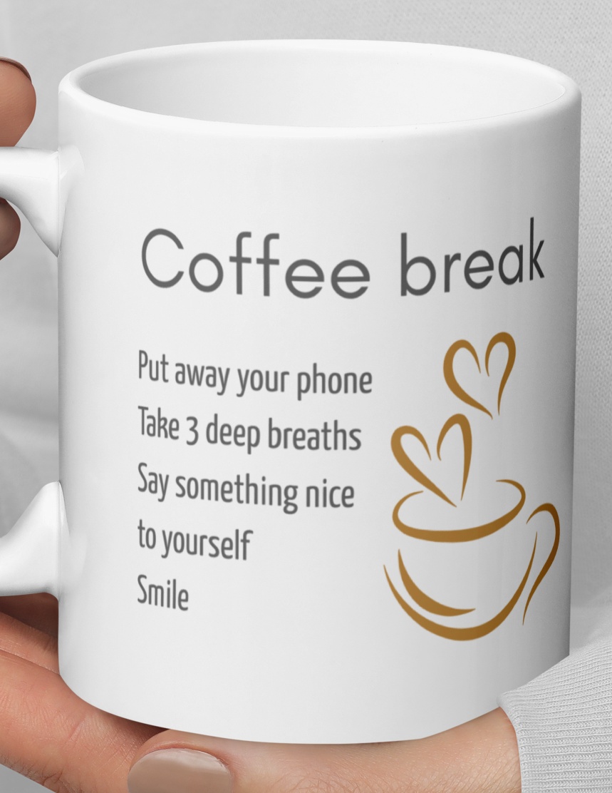 Texten på muggen lyder: "Coffee break Put your phone away Take three deep breaths Say something nice to yourself Smile"
