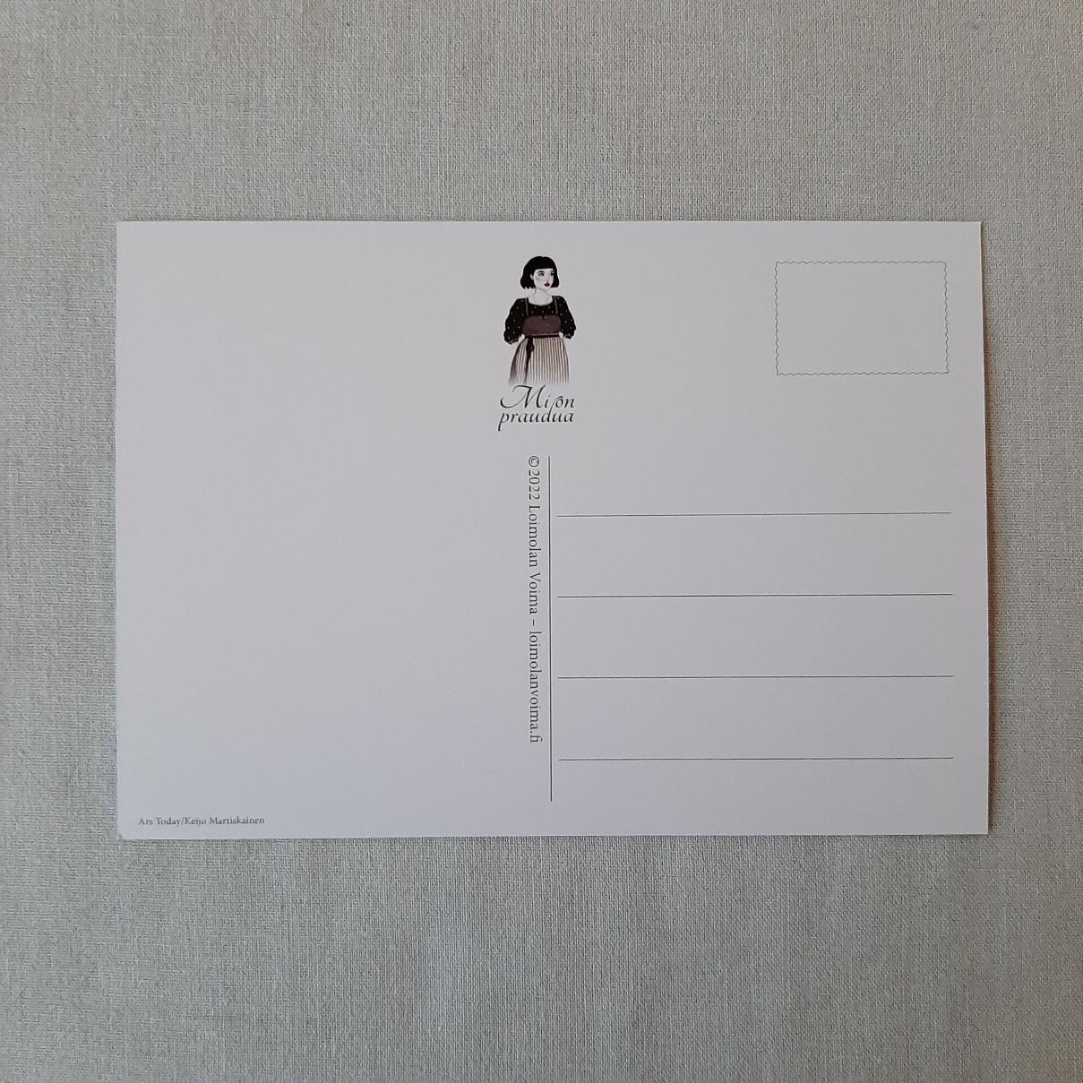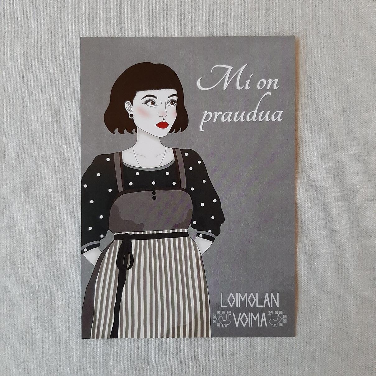 Mi on praudua -postikortti. Paperi Colotech+ 300g (laadukas sileä matta). Koko A6, 105×148 mm.