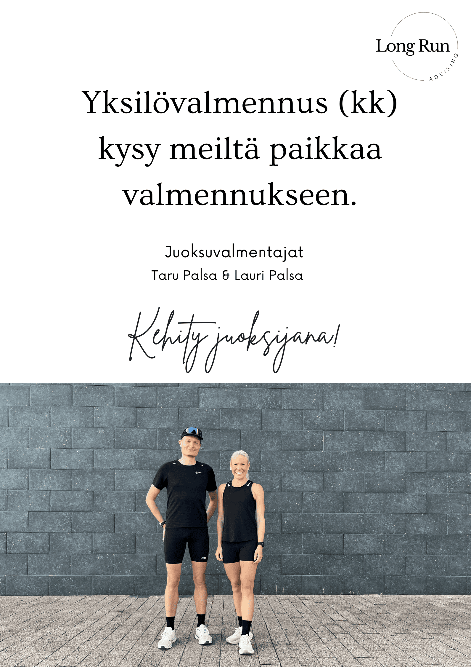 Haluatko juoksuharjoitteluusi selkeän rakenteen, tavoitteellisuutta ja jatkuvaa asiantuntevaa tukea? Yksilövalmennuksessa saat täysin henkilökohtaisen, kuukausittain päivittyvän juoksuohjelman, joka rakennetaan tavoitteidesi, lähtötasosi ja arkeesi sopivan kokonaisuuden pohjalta. Valmennuksen hinta on 99€ kuukaudessa. Siinä ei ole sitoutumisaikaa.