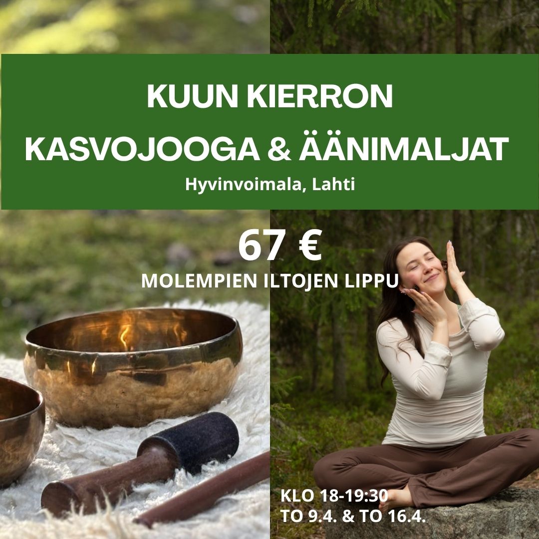 Lumme Flow`n Vilma & Hoitola Unelmakulman Sanna kutsuvat sinut kuun kierron iltoihin, jossa laskeudumme yhdessÀ pysÀhtymÀÀn, palautumaan ja nauttimaan hemmottelusta kasvojoogan ja ÀÀnimaljojen ÀÀrellÀ. Harjoitus on suunniteltu tukemaan kehosi kukoistusta kuun vaiheita mukaillen. TÀmÀn illan jÀlkeen tunnet olosi kevyemmÀksi, levollisemmaksi ja kasvosi hehkuvat luonnollisesti sisÀltÀ ulospÀin. Voit osallistua molempiin iltoihin tai yksittÀiseen iltaan.