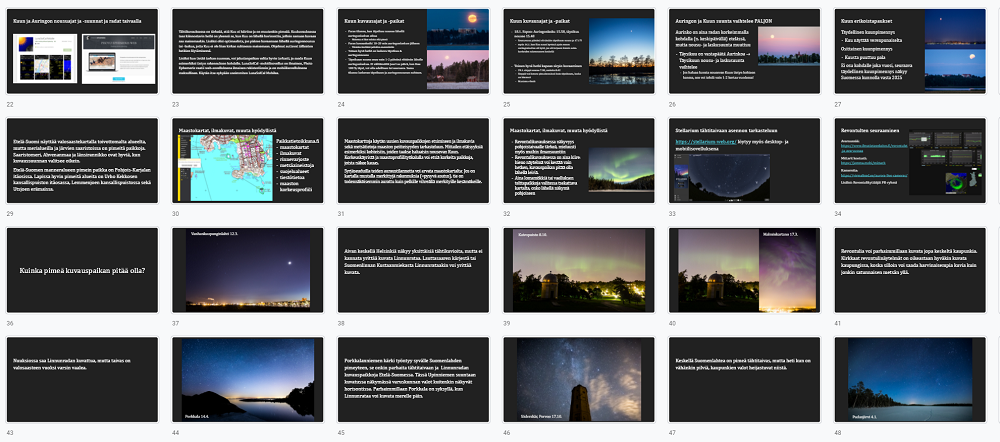 86 esitysdian laajuinen PDF-materiaali sisältää runsaasti käytännön vinkkejä tähtitaivaan, Kuun ja revontulien kuvaamiseen digitaalisella järjestelmäkameralla sekä kuvankäsittelyyn. Materiaali on tuotettu alun perin kahtena 2 h webinaarina toteutetulle verkkokurssille, ja sitä on täydennetty kurssin aikana esiin nousseilla aiheilla. Materiaalista saa eniten irti, jos ymmärtää valokuvauksen peruskäsitteitä, kuten aukko, suljinaika ja polttoväli. Esitietoja tähtitaivaan, Kuun tai revontulien kuvaamisesta ei tarvita.