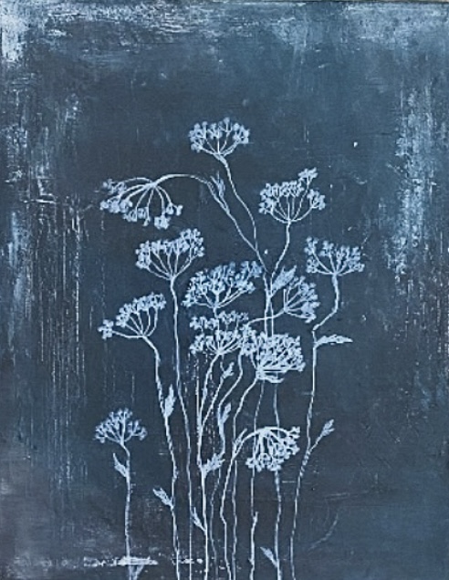 40 x 50 cm. Tekstuurinen maalaus kangaspohjalla. Valkoiseksi maalatut ryhdikkäät reunat. Pinnassa kimmeltäviä yksityiskohtia, niin kun pakkanen saa kuurankukat kimaltamaan.