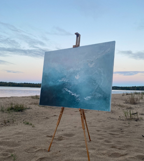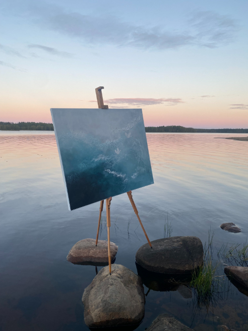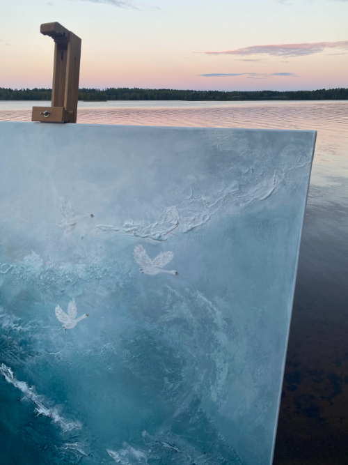Hiljaisuus kertoo kaiken kun malttaa kuunnella. Kolme joutsenta - menneisyys, nykyhetki, tulevaisuus. Eivät taistelemassa keskenään vaan lentämässä samaan suuntaan. Kaiken jälkeen kuulen itseni. Ripustusvalmis 116 x 89 cm kokoinen maalaus toteutettuna kankaalle. Paljon käsinkosketeltavaa tekstuuria. Valkoiseksi maalatut reunat tuovat kehysmäistä ryhdikkyyttä. Hintaan sisältyy toimitus kotiovelle.